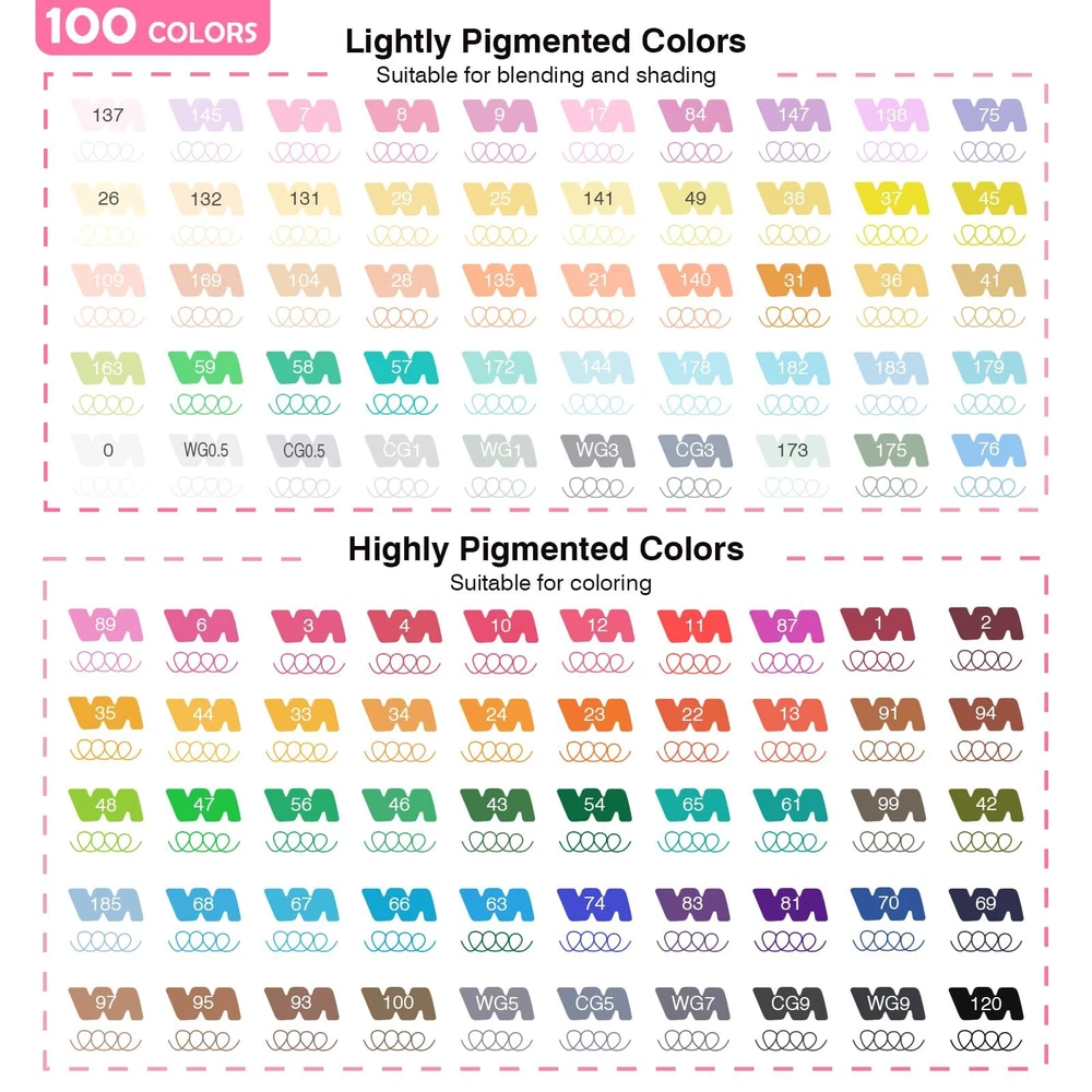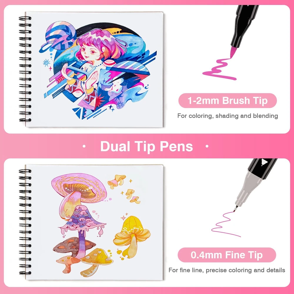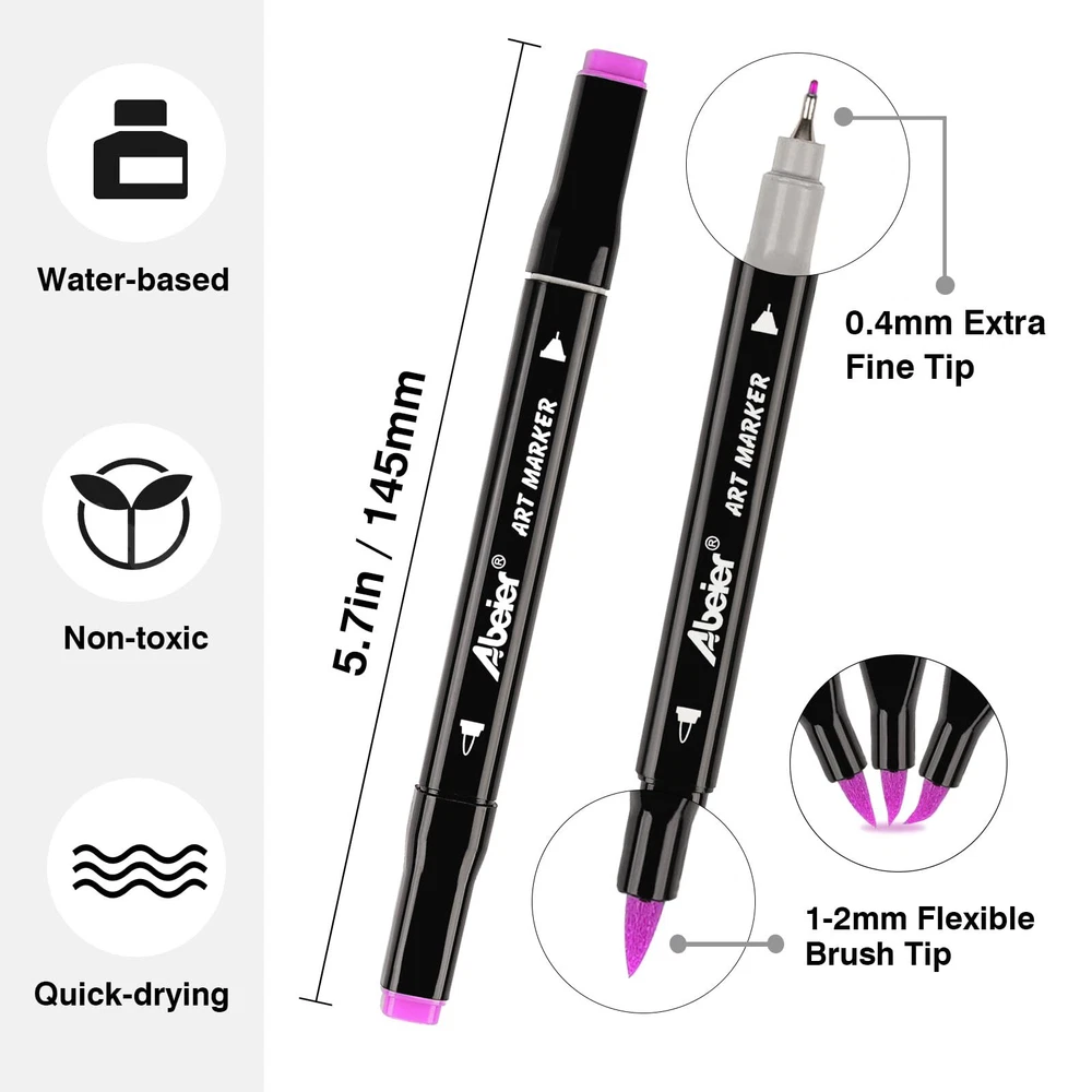 DUAL TIP VERSATILITY: Experience the convenience of dual-tip markers! The 0.4mm fine tip is perfect for precise lines, writing, and drafting, while the 1-2mm brush tip excels in coloring books, signing, art projects, and hand lettering. Effortlessly switch between tips for a seamless drawing process. 100 VIBRANT COLORS: Unleash your creativity with a stunning array of 100 unique and vibrant colors, ensuring there are no duplicates. Whether you're a beginner or a seasoned artist, these markers offer a rich spectrum of hues to elevate your artistic expression. PREMIUM INK QUALITY: Enjoy odorless and harmless water-based ink that's easily washable on clothes and skin. Experience flawless performance with no skipping or ink flow issues. Keep the caps on when not in use to prevent the tips from drying out. GREAT GIFT CHOICE: Make someone's day with this ideal art set gift! Perfect for family, friends, and artists of all skill levels, these markers make a thoughtful present for birthdays, Thanksgiving, Christmas, and more. Ideal for adult coloring books, sketching, illustrations, planning, journaling, manga, design, and various art projects. Elevate your artistic endeavors with this comprehensive set!