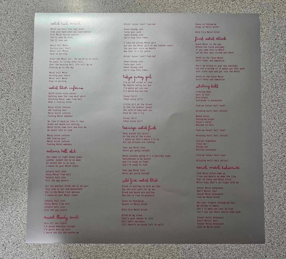 ABIGAIL "SWEET BABY METAL SL*T" LP Item Description ABIGAIL "SWEET BABY METAL SL*T" LP (NUCLEAR WAR NOW! PRODUCTIONS 2022) BLACK/THRASH METAL FROM JAPAN !!! REISSUE !!! COVER CONDITION-NEW VINYL CONDITION-NEW NOT SEALED(NEVER BEEN PLAYED) VINYL COLOR-PINK WITH WHITE AND CLEAR SPLATTER INCLUDE 12" INSERT WITH CREDITS AND LYRICS Tracklist: SIDE FRONT: A1. METAL EVIL METAL A2. METAL B*TCH INFERNO A3. SATANIC HELL SL*T A4. SWEET BLOODY C*NT A5. TOKYO PU**Y GIRL SIDE BACK: B1. TEEN AGE METAL F*CK B2. WILD FIRE METAL B*TCH B3. FINAL METAL ATTACK B4. WITCHING HELL B5. SEXUAL METAL HOLOCAUST BUYER PAYS $6.99 USA(INSURANCE INCLUDED-MEDIA MAIL,SHIPPING AND HANDLING)WE ONLY SELL VINYL TO THE USA.SEE MY OTHER ITEMS FOR MORE RARE TITLES.