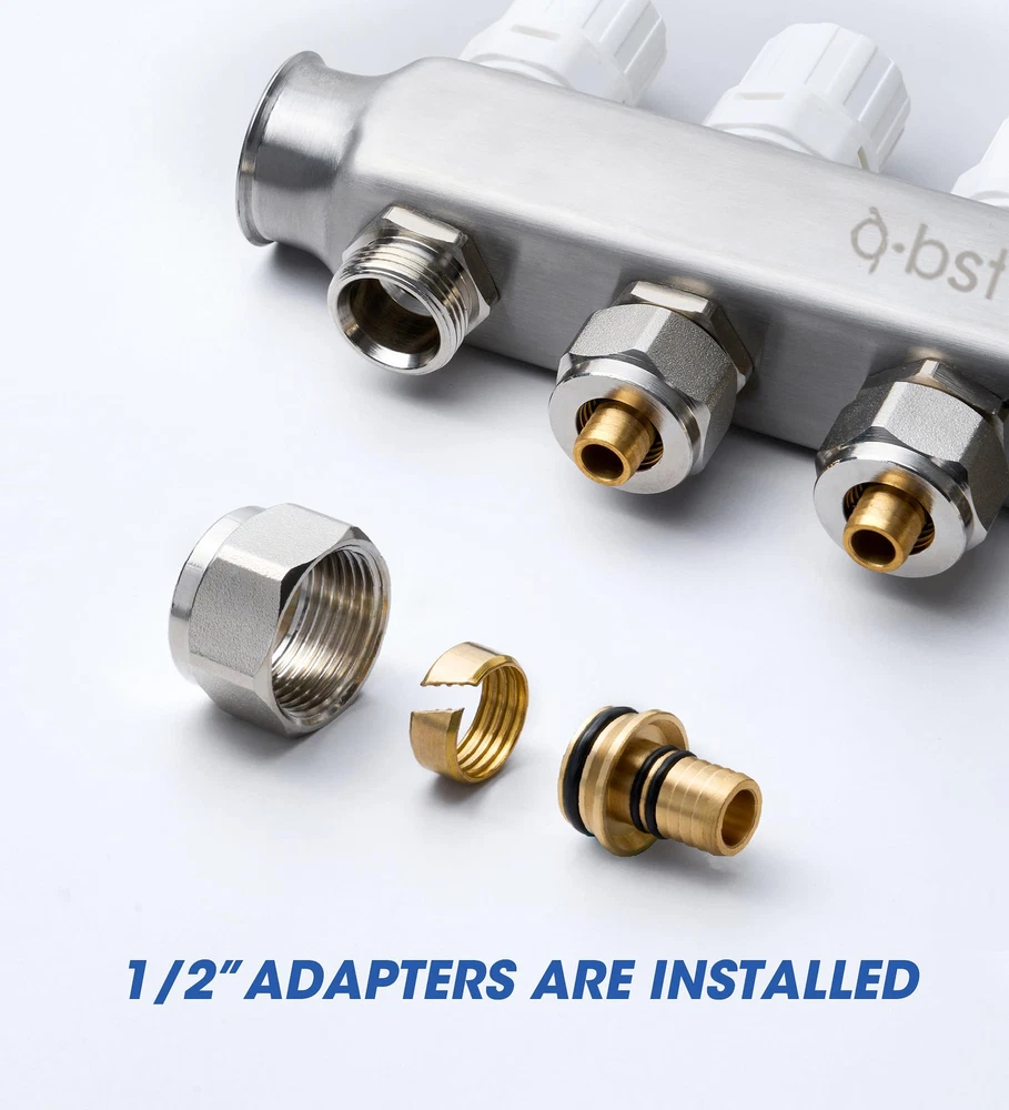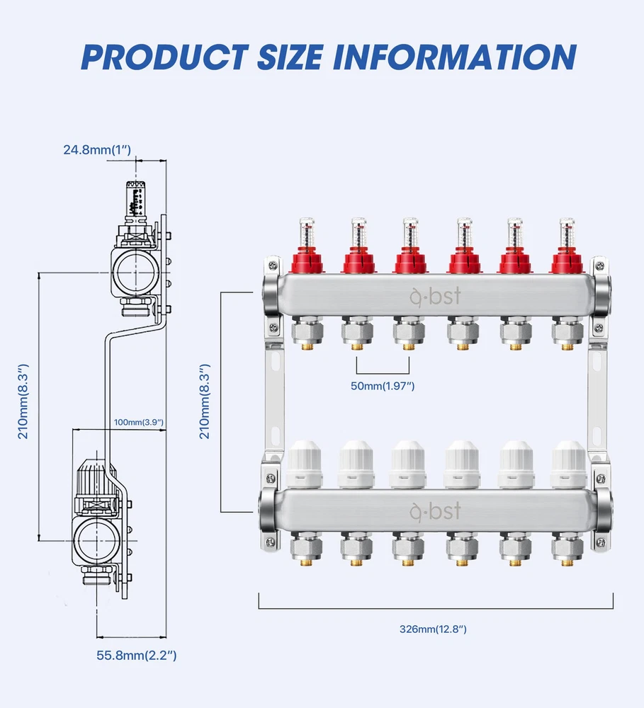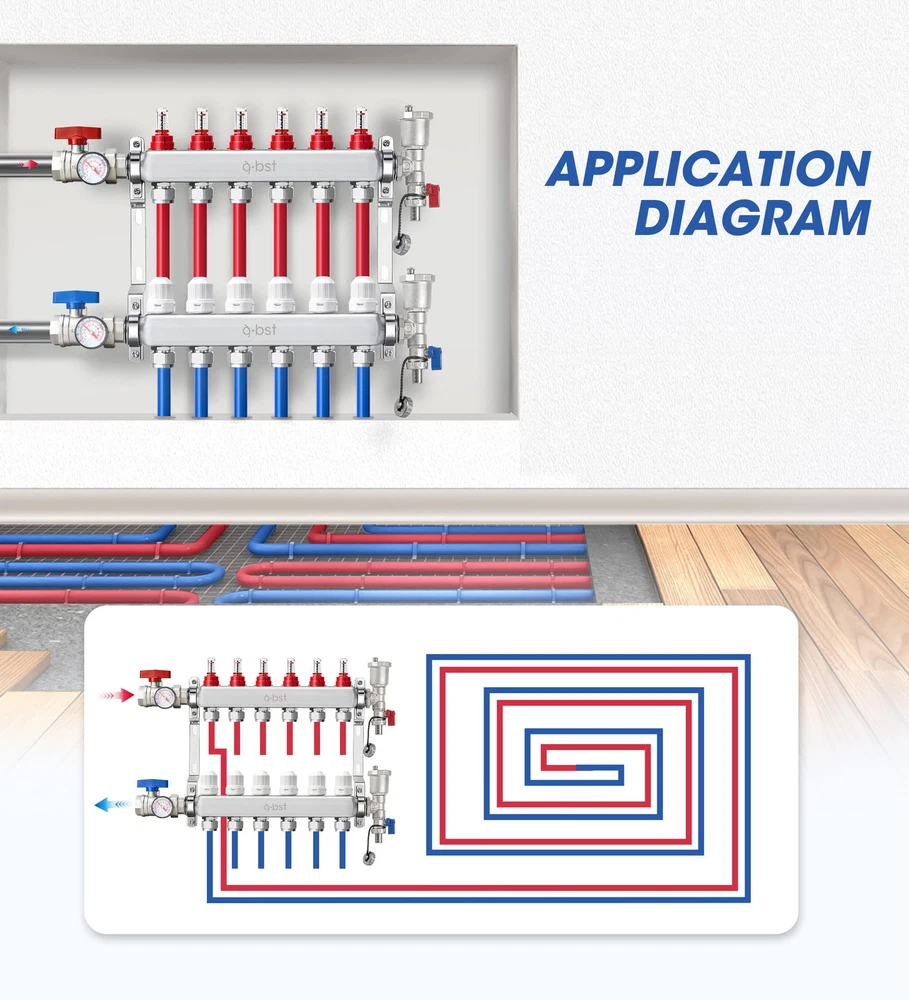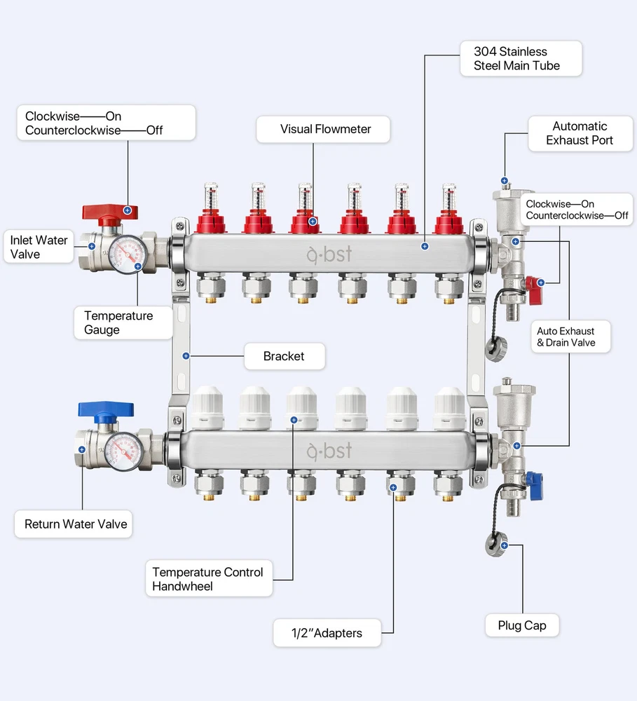 【Product Parameter】6 loops,1" NPT supply and return shut-off ball valves,up to 1.4GPM high flow meter,1/2" adapters included(12 pcs). 【High Quality】ABST PEX radiant manifold is made of high-quality 304 stainless steel material,which is wear-resistant,anti-corrosion,pressure-resistant,and has a higher thermal conductivity,transmitting heat more effectively. 【Easy to Install】The floor heating manifold kit is equipped with a stainless steel mounting bracket,which can fix the water distributor on the wall or the box.Simply use regular pliers to install the main on the bracket and connect the inlet and outlet main valves to the automatic exhaust and drain valves.Pressure tested and pre-assembled for peace of mind. 【Auto Drain Exhaust】There is more gas in central heating,and the use of automatic exhaust and drain valves can effectively remove the gas in the pipe,increase the flow,and improve the heating effect. 【PEX Radiant Heat Manifold Kit】Each kit includes flow meter,auto exhaust &drain valve,1/2”adapters,temperature control handwheel,centigrade fahrenheit integrated temperature gauge,inlet&return water valve.