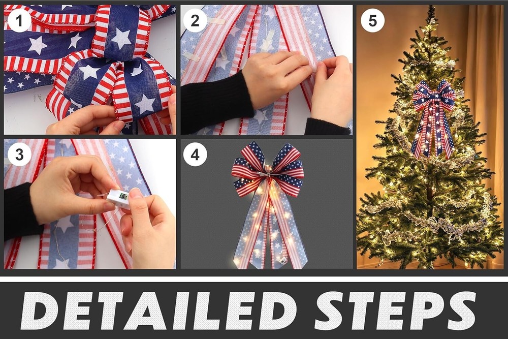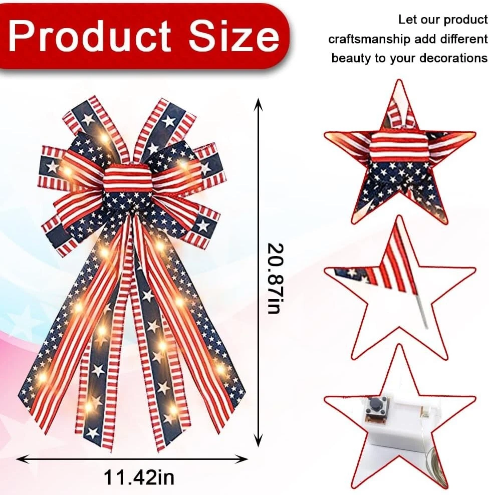 Patriotic style bow: you will get 1 piece of 4th of July LED patriotic star wreath bow, which is designed to be multilayered and three-dimensional, featuring an atmosphere of rejoicing and festivity and bringing you lots of fun to your July 4th party. Patriotic Tree Topper Bow Material: This decorative wreath bow is made of premium plaid cloth, with big bowknot shape, simple but fashion, durable and handmade, lightweight and long-term for you to apply, also not easy to break or fade. Appropriate dimensions: This Veterans Day bow measures 11.42 inch wide and 20.87inch long, which is large and prominent, suitable as centerpiece decoration. Red Blue White Stripe Bows Easy to Use: take out the Memorial Day America flag wreath bows, organize the details, you can restore perfection. Put down the ribbon, then put it on the door, Ideal hanging accessories for archway or wall while Veteran's Day, Christmas,Thanksgiving, Memorial Day, 4th of July, Independence Day Decorations. Can be used for prom, party, church meetings, dancing party, summer picnic, wedding or any other special soiree decoration. Farmhouse Large Gift Bow Wide Application: DIY yarn ornament bows are suitable for kinds of occasions, can be widely applied in 4th of July party or activities, home decors,attach the bow to wreaths, arches, stairways, chairs and other DIY craft projects.Use and satisfy your various decoration requirement in daily life, you can also share them with others.
