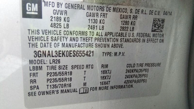 Inventory ID: 6656031 Designation: Used Make: CHEVROLET eCommerce Description: Sold As Pictured Genuine OEM: Yes Interchange Part Number: 682-01025 Year: 2014 Manufacturer Warranty: 6 Month Conditions & Options: 2.4 Stock #: D1A211 Mileage: 84000 Donor VIN: 3GNAL3EK0ES655421 Brand: CHEVROLET GTIN: Does not apply VIN #: 3GNAL3EK0ES655421 PartNumber: 682 Model: CAPTIVA S