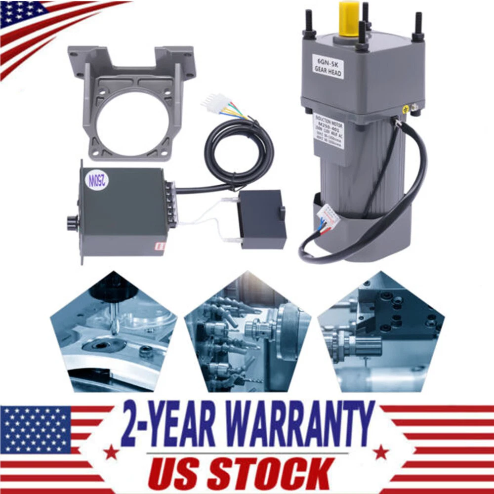 Application This product is widely used in industrial assembly lines, intelligent equipment, animal husbandry machinery, printing machinery, textile machinery, instrumentation, food machinery, power transmission and transformation equipment, road gate machines, medical equipment, logistics equipment, security check facilities, financial equipment, new energy, industrial robots, and other industries. Package Included 1 x Motor 1 x Reduction Gearbox 1 x Governor 1 x Bracket Packing Size: 33*26*13cm/12.99*10.23*5.11in Gross Weight: 7.9kg/17.41lbs Net Weight: 7.3kg/16.09lbs Adjustable Speed: You can adjust the speed from 0% to 100%(0-270rpm) through the stepless speed knob on the governor according to the different situations to achieve the desired effect. AC High Torque Motor 110V 60Hz 250W Electric Reversible Motor Single-Phase Motor AC High Torque Motor 110V 60Hz 250W Electric Reversible Motor Single-Phase Motor Description The product includes a complete set of accessories. In addition to the motor, it is also equipped with a bracket, a reducer, and a speed regulator for your convenience. This gear adjustable motor is primarily used to reduce the speed of a series of gears, thereby producing more power torque to improve working efficiency. Key Features Strong and Durable: The housing of this product is made of high-quality aluminum alloy, which is strong, durable, wear-resistant, anti-shock, high-temperature resistant, and can protect the internal parts well. Stable Operation: Both ends of the speed control motor rotor are fitted with ball bearings, which allow it to operate with low friction, reduce energy consumption and generate lower temperatures to ensure stable operation. High Efficiency: The stator and rotor are made of pure copper coils with good electrical conductivity, allowing for a constant high and stable power output. Adopting high-precision steel gears effectively increases the torque of the motor, which greatly enhances its working efficiency. Adjustable Speed: You can adjust the speed from 0% to 100%(0-270rpm) through the stepless speed knob on the governor according to the different situations to achieve the desired effect. Easy to Install: Since the motor and gearbox are already installed, you only need to plug the governor cable into the jack of the motor cable to quickly connect the motor and governor, which saves both time and labor. Forward and Reverse Rotatable: The governor is initially specified for forward rotation, but you can connect the wires on the CCW to the CW and then it can be converted to reverse rotation to suit your different needs. Good Heat Dissipation Performance: The motor has a built-in fan heatsink and cooling holes at the rear of the motor, providing good ventilation and heat dissipation to ensure stable performance and long service life. Low Noise: The speed control motor adopts high precision and high-speed bearings inside to bring you lower noise and create a quieter environment for you. Customer Service: We aim to provide quality products and services. If you have any problems, please feel free to contact us. We will reply and solve the problem for you as soon as possible. Details Indicator Light: The indicator light on the governor will be on when the power is on so that you can better understand the use status of the product. Motor Bracket: The bracket comes with triangular reinforced side plates for a stable structure, making the motor more firmly fixed without tilting or collapsing. Practical Governor: The governor is equipped with a threaded speed regulating knob, a speed scale panel, and a connector wiring description on the side, which is simple and easy to operate. It is also equipped with a one-button power switch, making it safer to use. Application This product is widely used in industrial assembly lines, intelligent equipment, animal husbandry machinery, printing machinery, textile machinery, instrumentation, food machinery, power transmission and transformation equipment, road gate machines, medical equipment, logistics equipment, security check facilities, financial equipment, new energy, industrial robots, and other industries. Package Included 1 x Motor 1 x Reduction Gearbox 1 x Governor 1 x Bracket Packing Size: 33*26*13cm/12.99*10.23*5.11in Gross Weight: 7.9kg/17.41lbs Net Weight: 7.3kg/16.09lbs Notes 1.When the motor is working, it is normal for the temperature to rise to about 65℃/149℉. Please rest assured that it will not affect your use. 2.Please do not knock the motor and the body of the governor. 3.Please disconnect the power supply before changing the wire. 4.Please allow the slight color difference caused by the shooting light and 1-3cm error due to manual measurement, and make sure you do not mind before you order Payment Delivery details Terms of sales About us Contact us Payment We accept ebay payment 。 Fees such as import duties, taxes are not included in the item price or shipping costs. These charges are the buyer's responsibility. Delivery details Shipping: 2-9 working days to: USA Terms of sales We maintain high standards of excellence and strive for hundred percent customer satisfaction. Feedback is very important to us. We hope that you contact us immediately before you give neutral or negative feedback, so that we can address your concerns. It is impossible to address issues if we do not know about them! About us Your satis faction is our ultimate goal. We work hard to earn your trust and future business. Our certified technicians have tested each item before shipping. The unit comes with 1 year limited warranty on all manufacturing defects. a) If you receive a defective item, you may return it or ask for a discount. Please contact us within 14 days after you receive the package. b) What you returned must be intact and in its original packaging as re? u. Customer is responsible for shipping costs of the returned item. c) We will cover the cost of shipping back t with the shipping rate indicated in