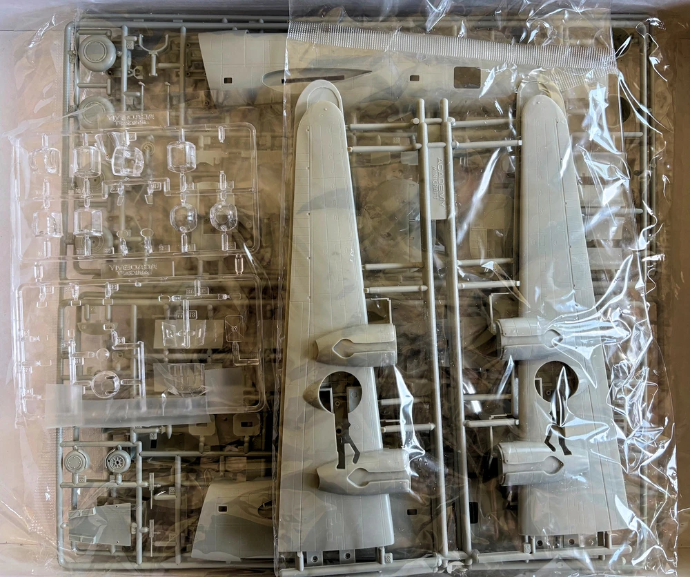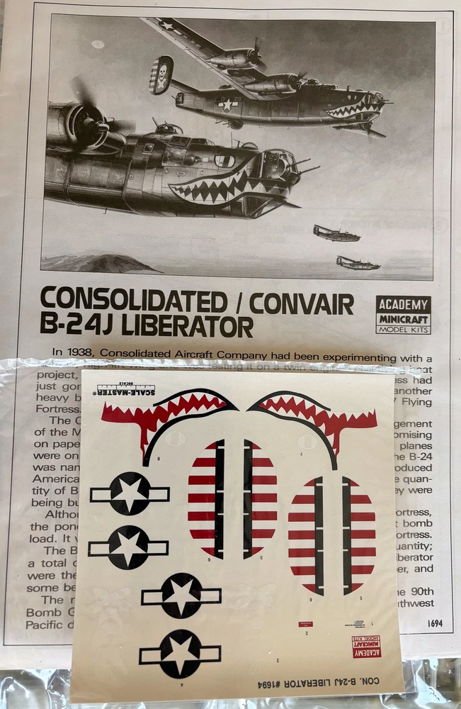 ACADEMY MINICRAFT 1/72-scale CONSOLIDATED B-24J LIBERATOR WW2 BG USAAF KIT #1694 ACADEMY MINICRAFT 1/72-scale CONSOLIDATED B-24J LIBERATOR WW2 BG USAAF KIT #1694 -------------------------------------- Additional Information from Internet Encyclopedia The Consolidated B-24 Liberator is an American heavy bomber, designed by Consolidated Aircraft of San Diego, California. It was known within the company as the Model 32, and some initial production aircraft were laid down as export models designated as various LB-30s, in the Land Bomber design category. At its inception, the B-24 was a modern design featuring a highly efficient shoulder-mounted, high aspect ratio Davis wing. The wing gave the Liberator a high cruise speed, long range and the ability to carry a heavy bomb load. In comparison with its contemporaries, the B-24 was relatively difficult to fly and had poor low-speed performance; it also had a lower ceiling and was less robust than the Boeing B-17 Flying Fortress. While aircrews tended to prefer the B-17, General Staff favored the B-24 and procured it in huge numbers for a wide variety of roles. At approximately 18,500 units – including 8,685 manufactured by Ford Motor Company – it holds records as the world's most produced bomber, heavy bomber, multi-engine aircraft, and American military aircraft in history. The B-24 was used extensively in World War II where it served in every branch of the American armed forces, as well as several Allied air forces and navies. It saw use in every theater of operations. Along with the B-17, the B-24 was the mainstay of the US strategic bombing campaign in the Western European theater. Due to its range, it proved useful in bombing operations in the Pacific, including the bombing of Japan. Long-range anti-submarine Liberators played an instrumental role in closing the Mid-Atlantic gap in the Battle of the Atlantic. The C-87 transport derivative served as a longer range, higher capacity counterpart to the Douglas C-47 Skytrain. By the end of World War II, the technological breakthroughs of the Boeing B-29 Superfortress and other modern types had surpassed the bombers that served from the start of the war. The B-24 was rapidly phased out of U.S. service, although the PB4Y-2 Privateer maritime patrol derivative carried on in service with the U.S. Navy in the Korean War. The Liberator originated from a United States Army Air Corps (USAAC) request in 1938 for Consolidated to produce the B-17 under license. After company executives including President Reuben Fleet visited the Boeing factory in Seattle, Washington, Consolidated decided instead to submit a more modern design of its own. The new Model 32 combined designer David R. Davis's wing, a high-efficiency airfoil design created by unorthodox means, with the twin tail design from the Consolidated Model 31 flying boat, together on a new fuselage. This new fuselage was intentionally designed around twin bomb bays, each one being the same size and capacity of the B-17 bomb bays. In January 1939, the USAAC, under Specification C-212, formally invited Consolidated to submit a design study for a bomber with longer range, higher speed and greater ceiling than the B-17. The specification was written such that the Model 32 would automatically be the winning design. The program was run under the umbrella group, "Project A", an Air Corps requirement for an intercontinental bomber that had been conceived in the mid-1930s. Although the B-24 did not meet Project A goals, it was a step in that direction. Project A led to the development of the Boeing B-29 and Consolidated's own B-32 and B-36. Design The B-24 had a shoulder-mounted high aspect ratio Davis wing. This wing was highly efficient allowing a relatively high airspeed and long range. Compared to the B-17, it had a 6 feet (1.8 m) larger wingspan but a lower wing area. This gave the B-24 a 35-percent higher wing loading. The relatively thick wing held the promise of increased tankage while delivering increased lift and speed, but it became unpleasant to fly when committed to heavier loadings as experienced at high altitude and in bad weather. The Davis wing was also more susceptible to ice formation than contemporary designs, causing distortions of the aerofoil section and resulting in the loss of lift, with unpleasant experiences drawing such comments as, "The Davis wing won't hold enough ice to chill your drink".[9] The wing was also more susceptible to damage than the B-17's wing, making the aircraft less able to absorb battle damage. The wing carried four supercharged Pratt & Whitney R-1830-35 Twin Wasp engines mounted in cowlings borrowed from the PBY Catalina (similar except for being oval in cross-section allowing for oil coolers mounted on each side of the engine) that turned 3-bladed variable-pitch propellers. The tailplane featured two large oval vertical stabilizers mounted at the ends of a rectangular horizontal stabilizer. As early as 1942, it was recognized that the Liberator's handling and stability could be improved by the use of a single vertical fin. The single fin was tested by Ford on a single B-24ST variant and an experimental XB-24K: it was found to improve handling. However, all Liberators were produced with twin oval fins, with the exception of eight preproduction B-24N aircraft. The B-24N was intended as a major production variant featuring a single tail. Over 5000 orders for this version were placed in 1945, but they were cancelled due to the end of the war. The single fin did appear in production on the PB4Y Privateer derivative. The B-24's spacious, slab-sided fuselage (which earned the aircraft the nickname "Flying Boxcar") was built around two central bomb bays that could accommodate up to 8,000 pounds (3,600 kg) of ordnance in each compartment (but rarely did, as this decreased range and altitude). The forward and aft bomb bay compartments were further split longitudinally with a centerline ventral catwalk just nine inches 