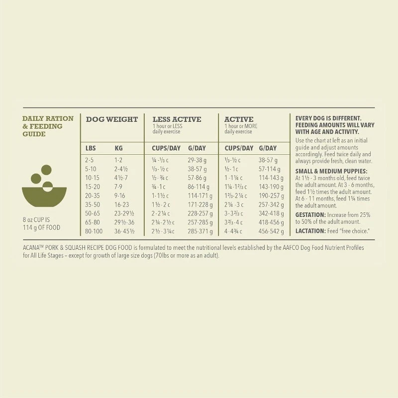 ACANA Singles Limited Ingredient Grain Free High Protein Dry Dog Food Pork & Squash Recipe 22.5lb Bag Flavor Name: Pork & Squash Recipe Size: 4.5 Pound (Pack of 1) Brand: ACANA Flavor: Pork & Squash Recipe Age Range (Description): All Life Stages Item Form: Dry Kibble Specific Uses For Product: Digestive Health, Immune Support, Skin and Coat Health About this item One (1) 22.5 lb bag of ACANA Singles Limited Ingredient Dry Dog Food, Grain Free*, High Protein, Pork & Squash Recipe Made with pork and pork liver, this grain free dog food is carefully crafted with 65 percent*** animal ingredients and 35 percent**** whole fruit, vegetables and nutrients to satisfy your dog’s cravings Features a freeze dried dog food coating for a delicious taste your dog will love and contains a blend of fiber, prebiotics and probiotics to help support your dog's digestion and gut health ACANA dog food offers a recipe rich in protein from a single animal source** that is balanced with butternut squash, pumpkin and sweet potato to help your dog maintain a healthy weight High protein dog food kibble made in the USA with quality ingredients from around the world