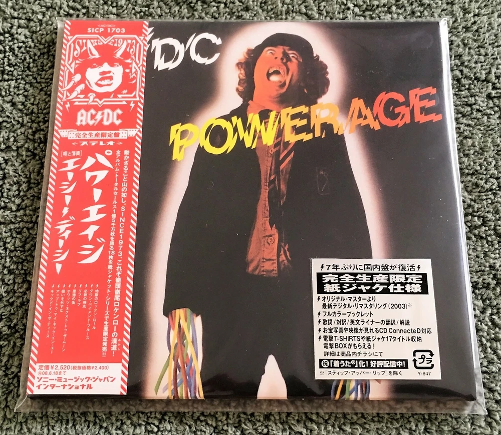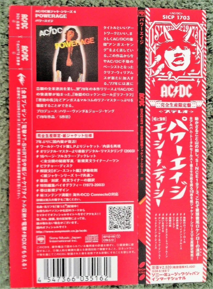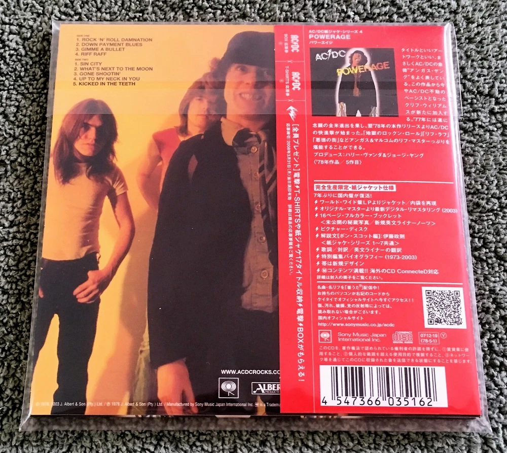 AC/DC – Powerage Label: Albert Productions – SICP 1703 Format: CD, Album, Limited Edition, Remastered, Enhanced, LP Replica Sleeve Country: Japan Released: Dec 19, 2007 Genre: Rock Matrix / Runout: PLDA-12X 1 Barcode: 4547366035162 Mastering SID Code: IFPI L275 Track Listing 1 Rock 'N' Roll Damnation 3:35 2 Down Payment Blues 6:00 3 Gimme A Bullet 3:21 4 Riff Raff 5:14 5 Sin City 4:40 6 What's Next To The Moon 3:28 7 Gone Shootin' 5:04 8 Up To My Neck In You 4:10 9 Kicked In The Teeth 3:52 * This CD takes advantage of ConnecteD technology and will work as a key to unlock exclusive bonus music, videos, photos and more at www.acdcrocks.com Item will be shipped inside a sturdy cardboard box. Shipping is $2.00 via USPS Media Mail in the United States. I combine shipping costs, each additional item is $1.00 International customers, please contact me if interested. All items are authentic and as described, guaranteed.