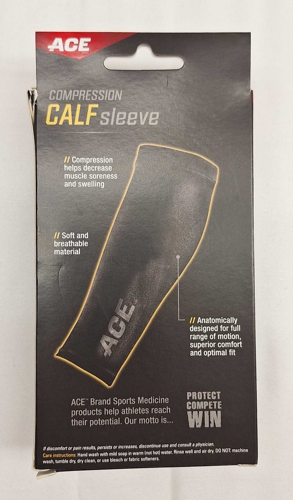 ACE Compression Calf Sleeve – Size S/M – Mild Support – NWT A brand-new ACE (3M) compression calf sleeve designed to help reduce muscle soreness, swelling, and recovery time. Made with soft, breathable material and shaped for optimal fit and full range of motion. Perfect for sports, workouts, running, or daily support. Comes in original box, never used. 💛 Mild compression support 💛 Soft + breathable material 💛 Anatomically designed for comfort + movement 💛 Ideal for basketball, football, volleyball Size: S/M (13.0–15.25 in / 33.0–38.7 cm calf circumference) Condition: New with tags (boxed) Material: Not listed (standard ACE performance blend) Color: Black Made in: China