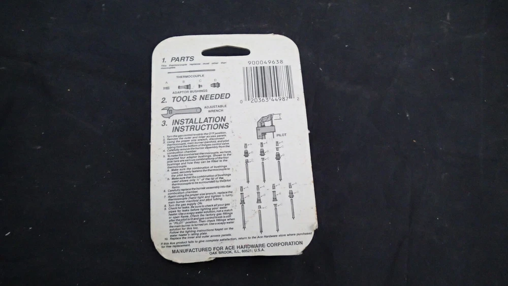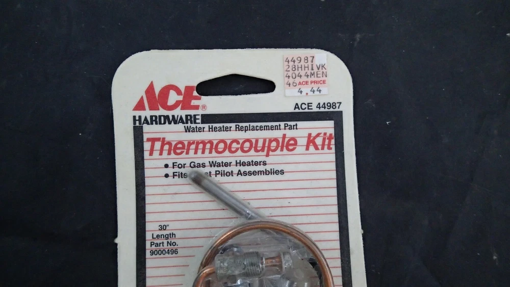 Modified Item: No Power Source: Gas UPC: 020363449872 Custom Bundle: No gtin13: 020363449872 Non-Domestic Product: No Type: Water Heater Thermocouple/Thermopile Country/Region of Manufacture: Vietnam Brand: ACE MPN: 44987, 9000496 Smart Home Compatibility: Universal
