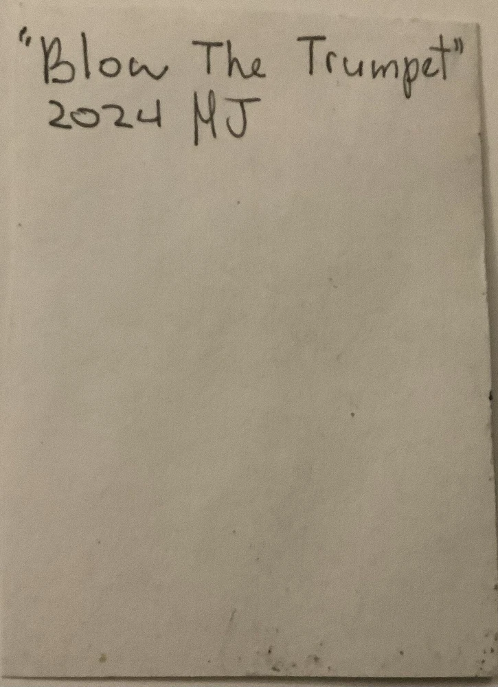 This is a unique, original ACEO painting titled "Blow The Trumpet" featuring an angel with a trumpet. The painting is signed by the artist MJ and made with acrylic paint on paper. It is a small piece measuring 2.5x3.5 inches and is unframed. The painting is a cartoon-style abstract piece with a Christmas and angel theme. It was produced in Tennessee, USA in 2024 and is a single piece for sale. The painting is handmade and is a great addition to any art collection.