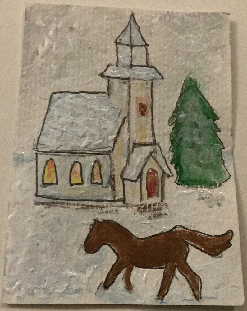 This original painting depicts a church in the snow and is signed by the artist MJ. Measuring 2.5x3.5 inches, this small painting is a unique piece of art that would make a great addition to any collection. The painting is handmade using acrylic paint on paper and was produced in Tennessee, USA in 2024. The painting is an abstract and cartoon style and features the themes of art, ACEO, Christmas, portrait, gifts. This painting is perfect for those who appreciate unique and one-of-a-kind artwork. Don't miss your chance to own this beautiful painting!