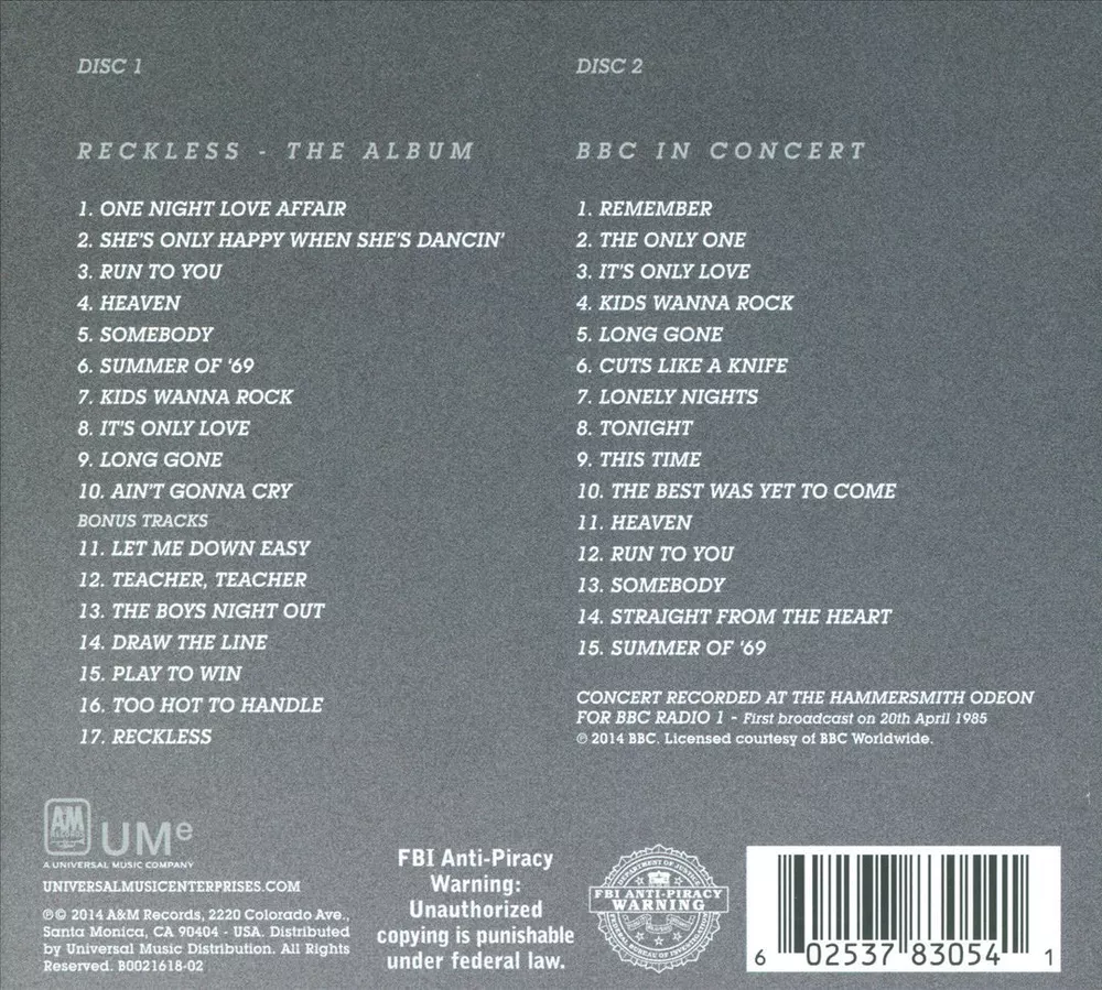 Format: CD Artist: Adams, Bryan Release Title: Reckless Release Year: 2014 gtin13: 602537830541 UPC: 602537830541 Record Label: Am, A&M Genre: Rock