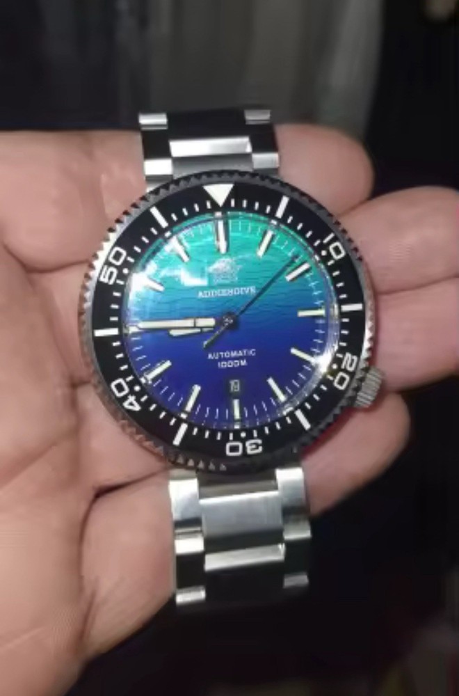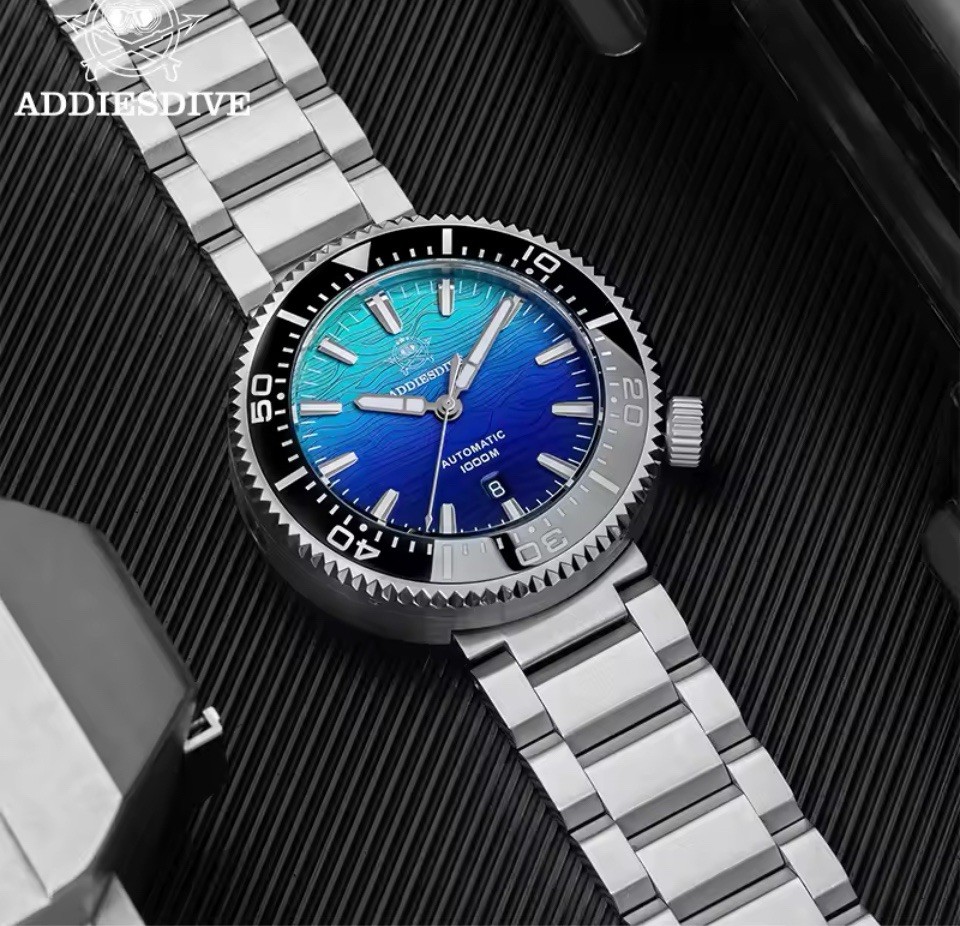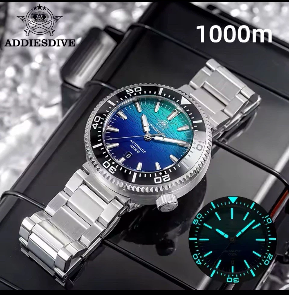 The ADDIESDIVE Men's Tuna 1000M Diver Watch is a stylish and functional timepiece designed for underwater adventures. With a silver case, black bezel, and blue dial, this automatic watch features a unidirectional rotating bezel, screwdown crown, and luminous hands and indexes for visibility in the deep sea. Water-resistant up to 1000 meters, this watch also boasts a 12-hour dial, sapphire crystal, and a 2-year manufacturer warranty. The sleek stainless steel bracelet and double-locking fold-over clasp ensure a secure fit on the wrist, making it a reliable choice for diving enthusiasts.
