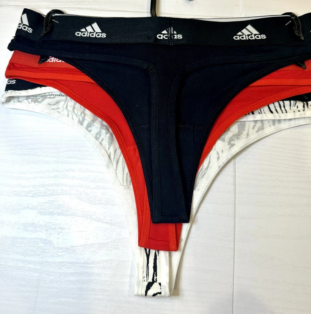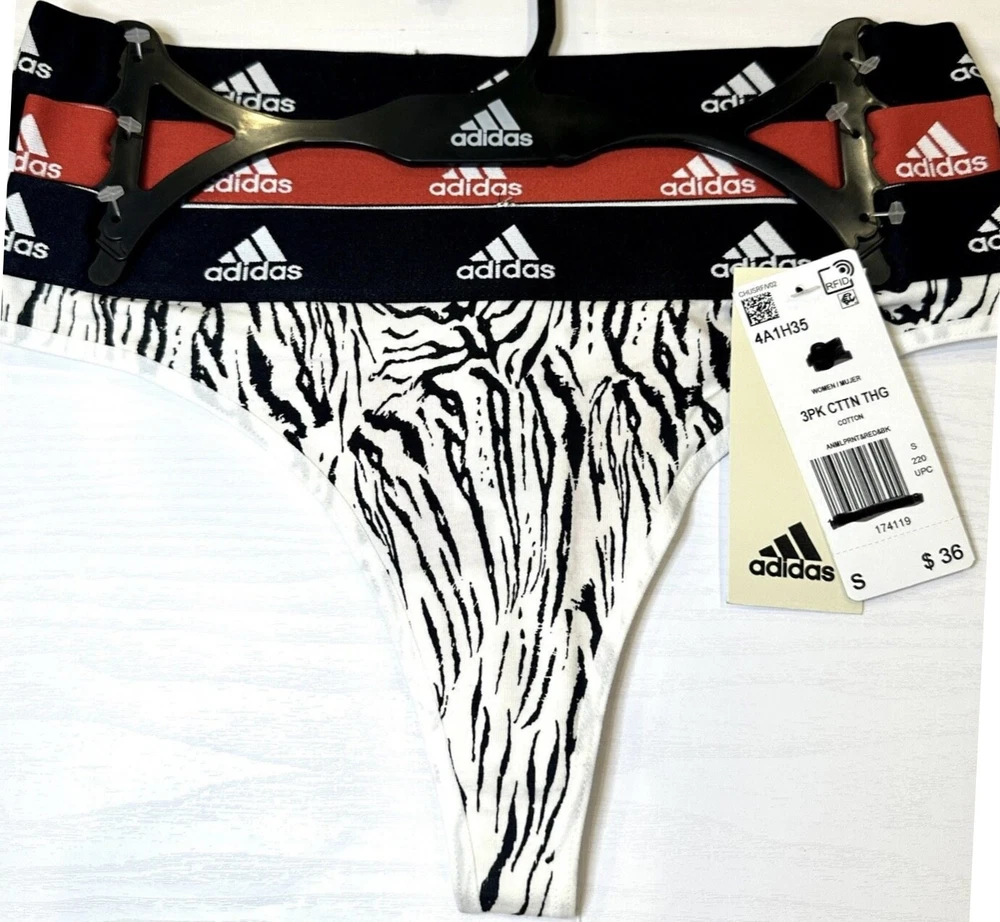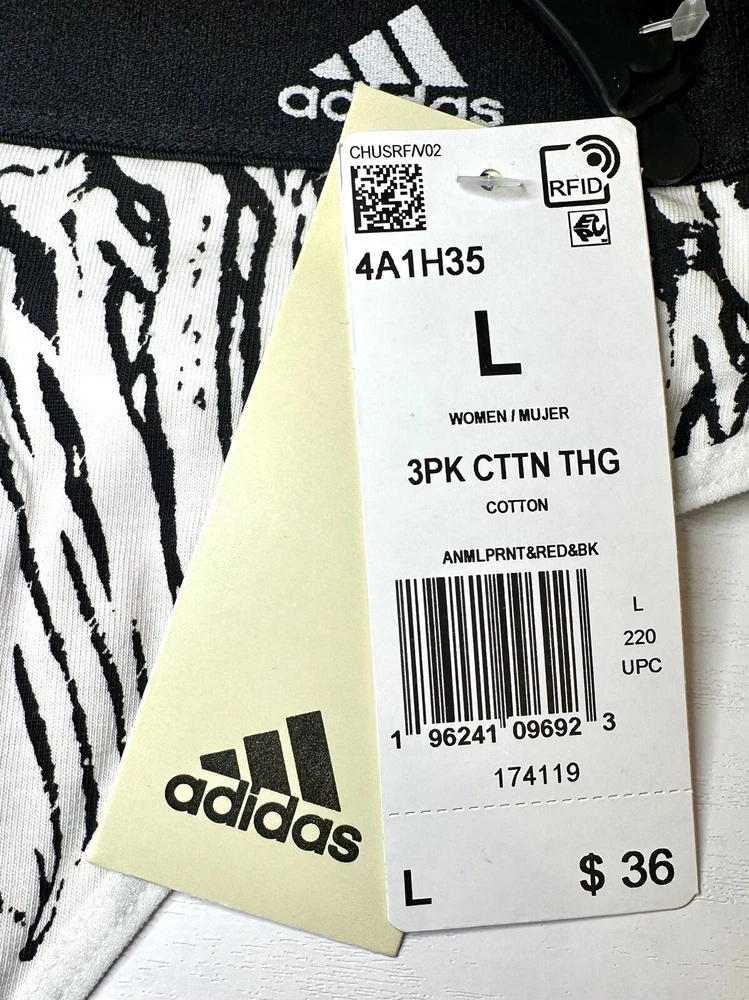 ADIDAS Women’s 3-Pack Active Comfort Cotton Thong Underwear Panty 4A1H35 Size L NEW With Tags!!! Please See All Pictures. ADIDAS 3-Pair Thong/String Panty Underwear WOMENS Size Available: LARGE PATTERN: Animal Print, Solid COLOR : White, Red, Black STYLE: # 4A1H35 RETAIL PRICE: $36.00 + Tax Description: 95% Cotton, 5% Spand ex Elastic Logo Waistband Thong; Little To No Back Coverage Machine Wash Warm Imported