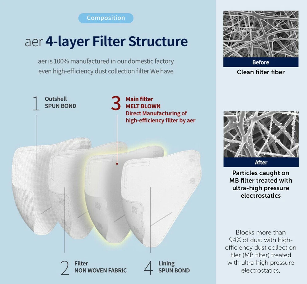 Made in Korea. Top selling item in Korea!. KOSDAQ listed No. 1 meltblown MB filter company productions. Brand new in sealed individual packages. *Kids size is for 4 to 12 years olds* 1 order equals 10 individual packs; order more and save more! FDA Surgical Medical Class 2 Grade Korea meltblown MB filter Reusable and disposable; do not wash for reuse; use it up to 8 total hours within a week for best protection. 94% protective filtration 4-layers premium filtration Top quality filters Aluminum nose support wire bridge Anti-slip; anti-fog on eyeglasses; anti-skin irritation test completed Bi-Folding Stereoscopic Design: easy to breathe and speak; no lip touch. No returns or exchanges accepted for healthcare products. It is final sale. Five or more orders are shipped via faster shipping method, priority mail. Same day shipping from California. We will do our best to ship out our packages as many as possible on the same day, so you can receive them earlier than expected. Most of our local orders (L.A., O.C.) will be delivered on the next day. We are a direct importer from Korean manufactures. You can trust us. We guarantee all of our items are 100% genuine, authentic, and Made in Korea. Thank you and stay safe!