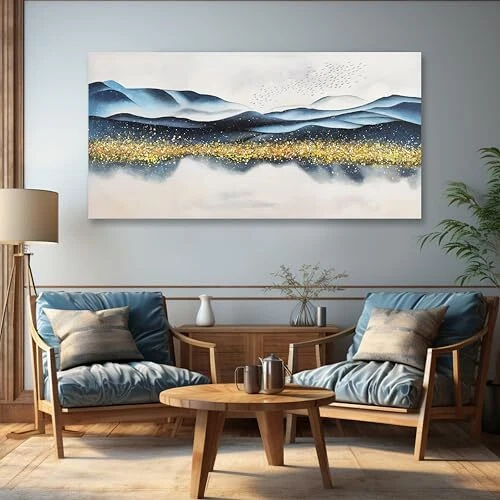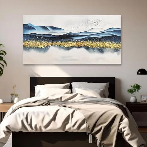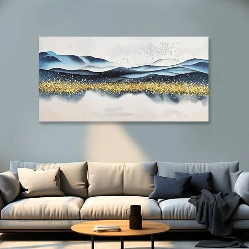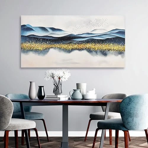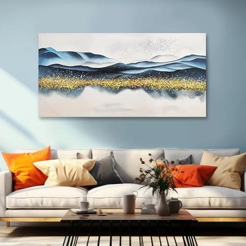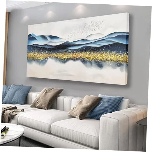 Return Policy Fast Delivery Trusted seller AERART Wall Decor Blue Gold Foil Ink Mountain Landscape Painting Canvas Wall Art Mountain View Artwork Canvas Painting for Living Room Bedroom Office Home Decor 24x48 in Product Description Canvas wall art size: 48inx24in(120cmx60cm) Please Measure Your Wall Properly And Make Sure You Pick The Right Size Easy hanging: This Abstract Paintings is packaged in a cardboard box with a hook on each wooden inner frame, which can be removed and hung after opening the box High definition printing: Modern advanced micro spray technology, highly restore the picture texture, rich color, for you to bring visual enjoyment Wall art decor: Wall decoration for living room, bedroom, bathroom, dining room, above fireplace, kitchen, home, office, master bedroom, porch, entryway, bar, hotel, etc Warm Reminder:T Is No Difference In The Product Itself, But Colors May Appear Slightly Different To Each User Due To Individual Monitors Shipping Returns Payment Shipping Shipping is FREE to all addresses other than APO/PO boxes in the lower 48 states. All our stock ships from US-based warehouses. Shipped via USPS or UPS (depending on location and package weight) Unless stated otherwise, all orders will ship within 24-72 hours of your payment being processed. Check our feedback to see the great reviews of FAST shipping we offer. Returns Seller does not accept returns Payment We currently accept payment via eBay managed payments only. Once payment is cleared, we will dispatch your shipment within 1-3 business days. Please refer to the "Shipping" tab for more information regarding shipping speed to your destination.
