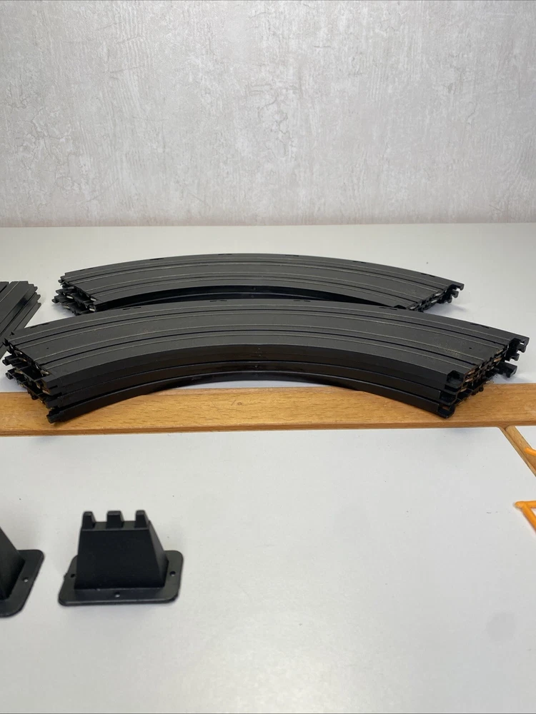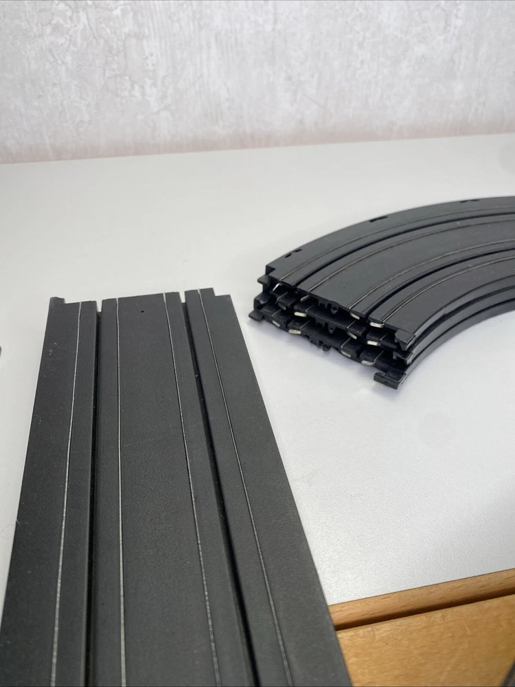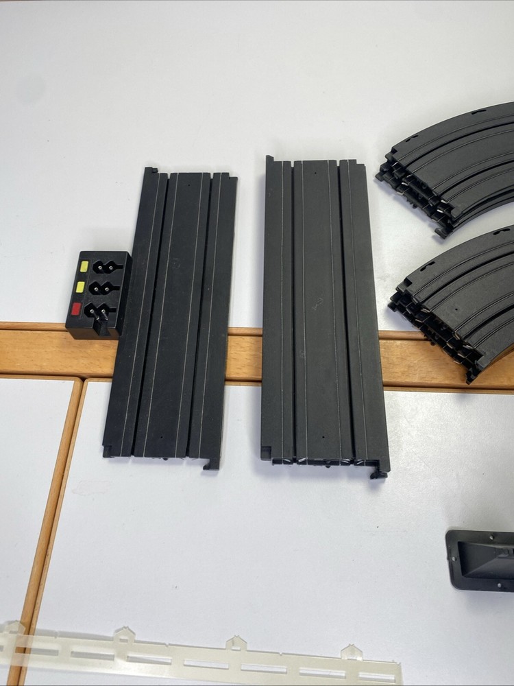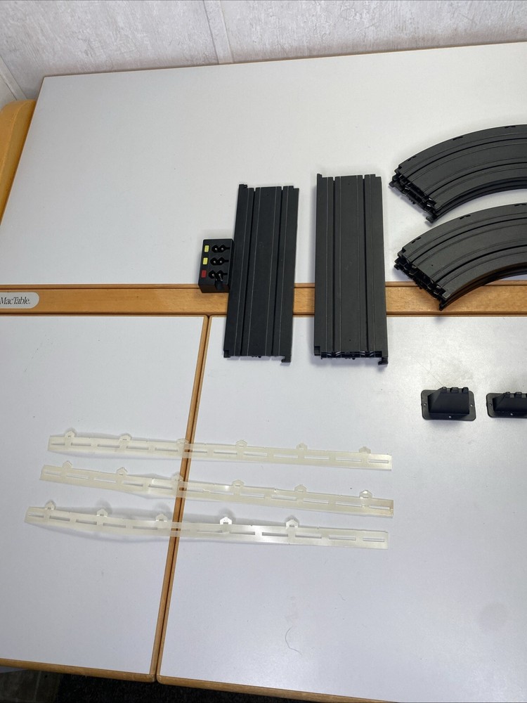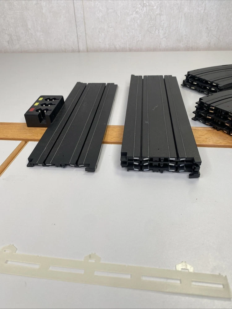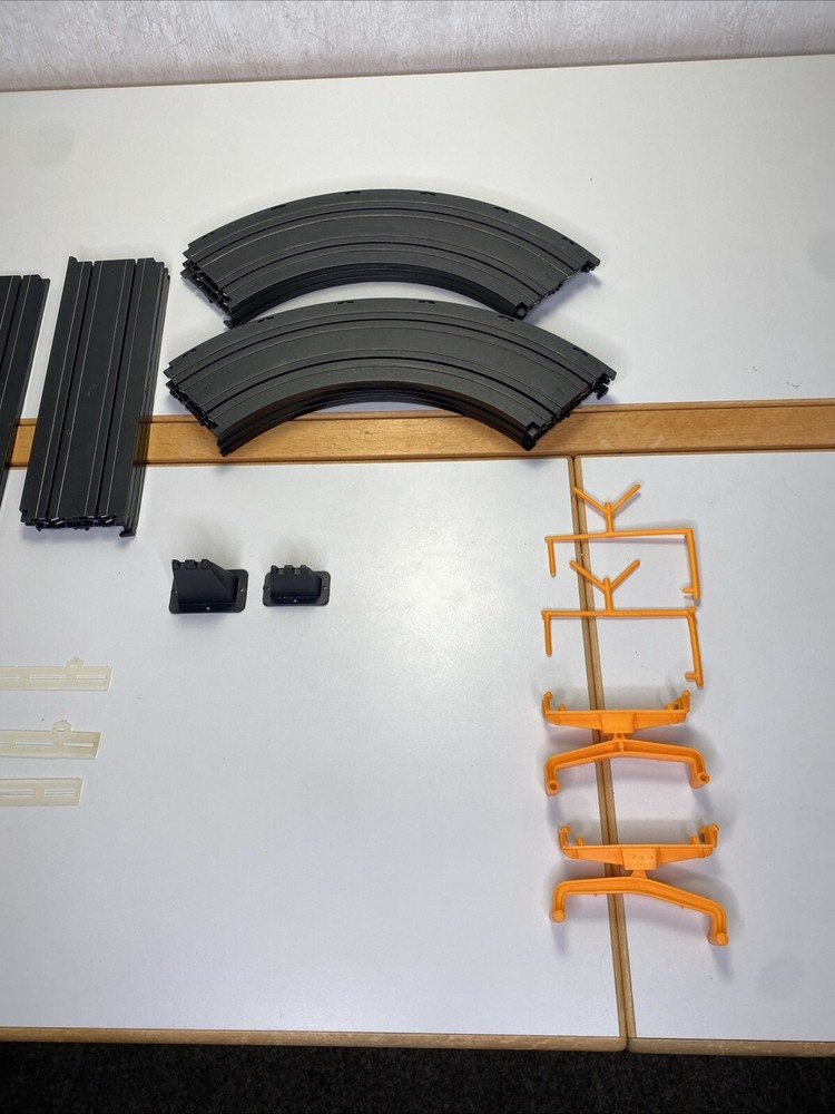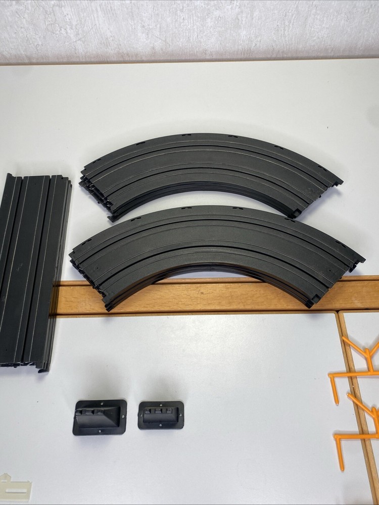 This afx aurora race track pieces come will 11 track pieces total. 7 curved pieces and 4 straight pieces. Also included is the bridge lifts and the side wall pieces. All these were left over from a box that I bought for the cars themselves. The last picture is a reference of what set it came from, and the box is not included. If you have any questions, please feel free to let me know. Thank you .