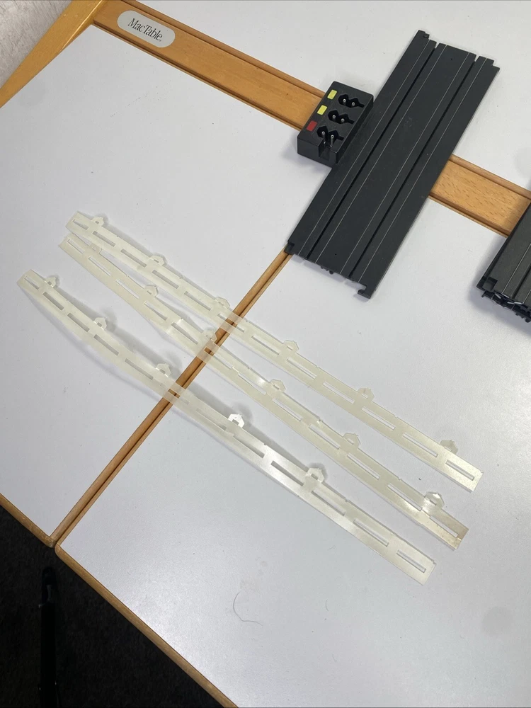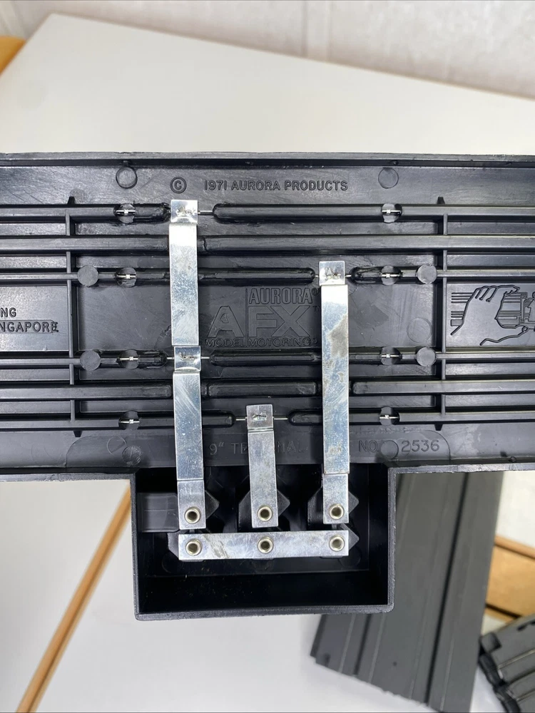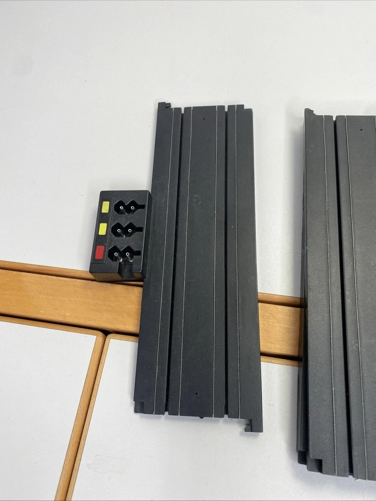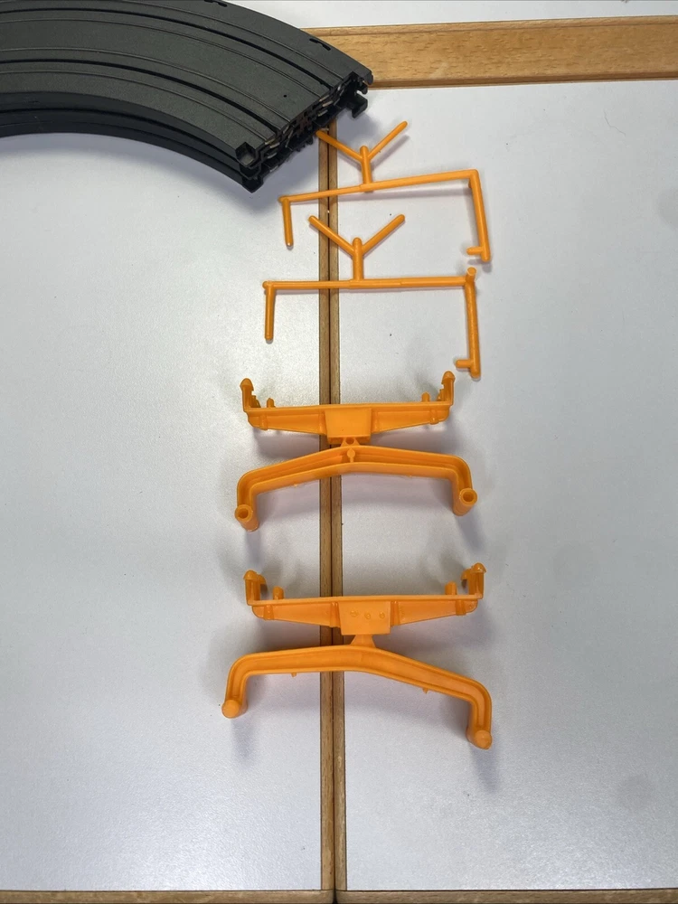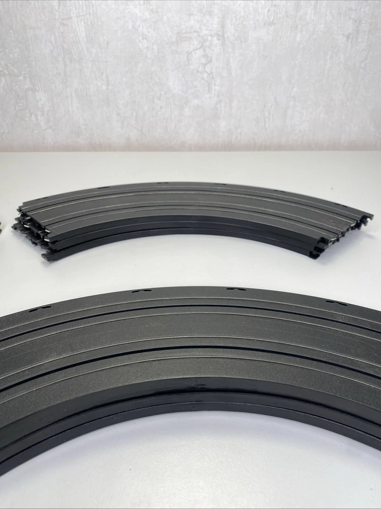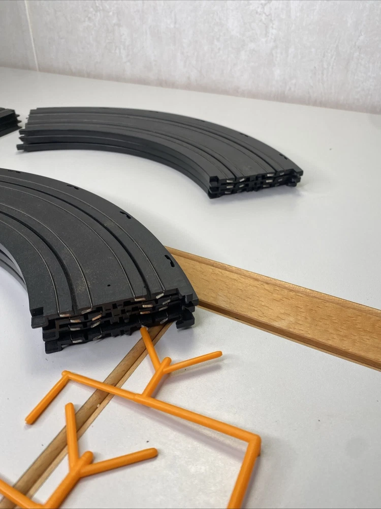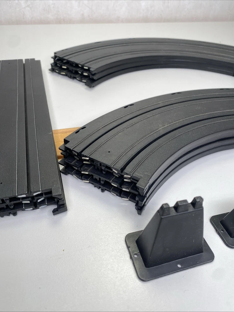 This afx aurora race track pieces come will 11 track pieces total. 7 curved pieces and 4 straight pieces. Also included is the bridge lifts and the side wall pieces. All these were left over from a box that I bought for the cars themselves. The last picture is a reference of what set it came from, and the box is not included. If you have any questions, please feel free to let me know. Thank you .