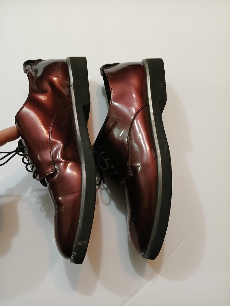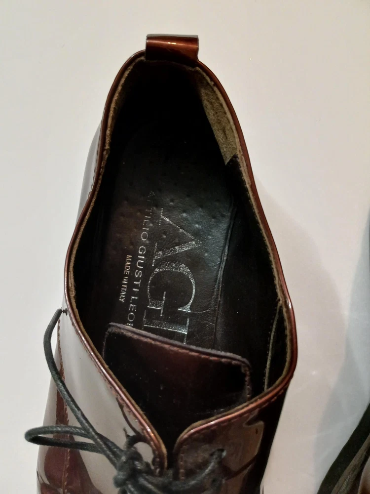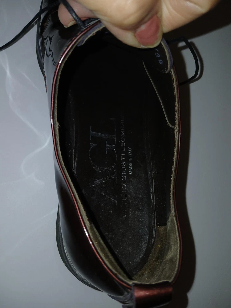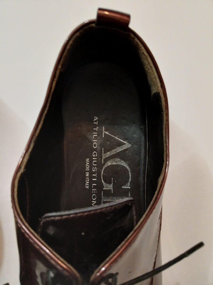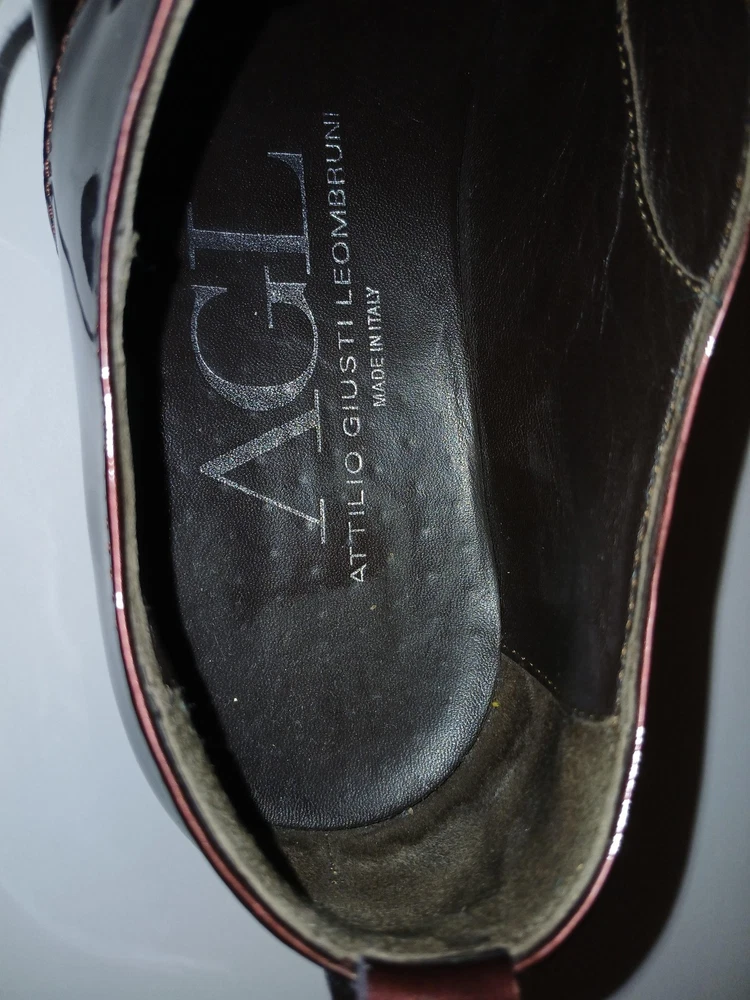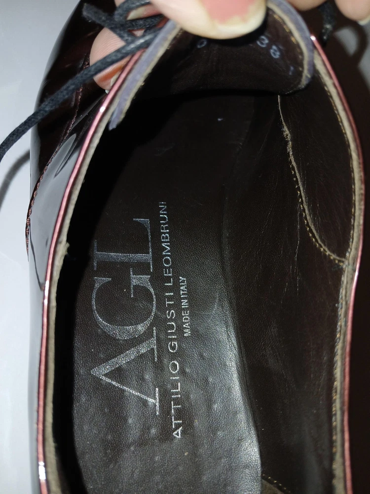 Brand: AGL Attilio Giusti Leombruni. Item: Womens lace up oxford flats with round toe and low platform sole. Color: Brown patent leather upper with a glossy finish. Size: US womens 8 with corresponding EU size 38 stamped inside. Material: Patent leather upper, leather lining and insole, and lightweight rubber outsole. Design details: Closed round toe with decorative perforations at the forefoot, four eyelet lace up closure with flat laces, and rear pull tab with metal AGL rivet detail. Features: Cushioned leather insole, lightweight Extralight branded rubber outsole for comfort, and low platform profile suited for all day wear. Branding and tags: Insole printed with AGL Attilio Giusti Leombruni Made in Italy logo; outsole molded with X Extralight branding; inner code reads N721021 and size 38. Occasion: Versatile patent leather flats ideal for business, office, or smart casual outfits.