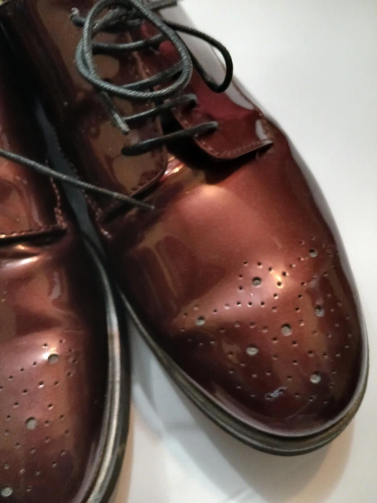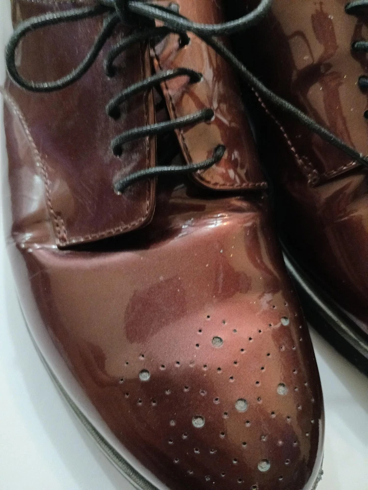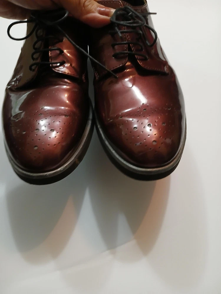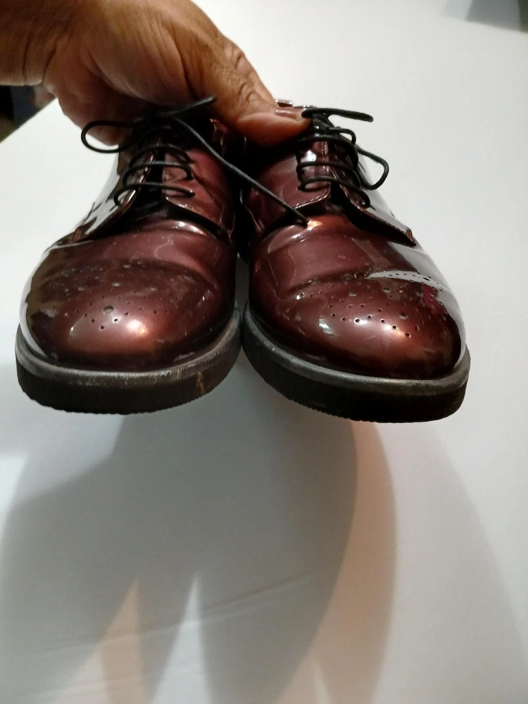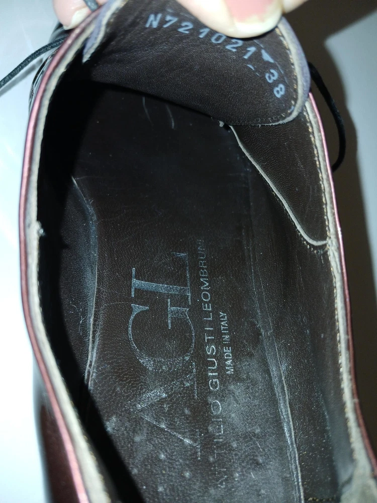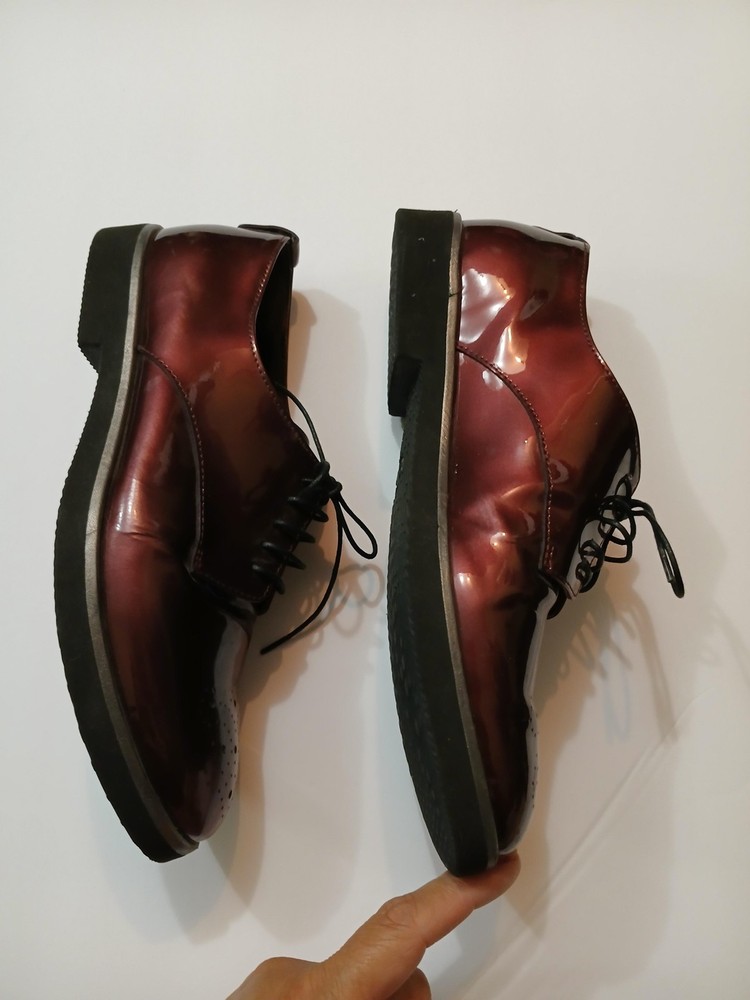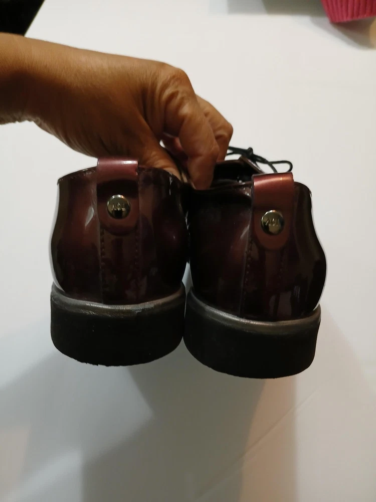 Brand: AGL Attilio Giusti Leombruni. Item: Womens lace up oxford flats with round toe and low platform sole. Color: Brown patent leather upper with a glossy finish. Size: US womens 8 with corresponding EU size 38 stamped inside. Material: Patent leather upper, leather lining and insole, and lightweight rubber outsole. Design details: Closed round toe with decorative perforations at the forefoot, four eyelet lace up closure with flat laces, and rear pull tab with metal AGL rivet detail. Features: Cushioned leather insole, lightweight Extralight branded rubber outsole for comfort, and low platform profile suited for all day wear. Branding and tags: Insole printed with AGL Attilio Giusti Leombruni Made in Italy logo; outsole molded with X Extralight branding; inner code reads N721021 and size 38. Occasion: Versatile patent leather flats ideal for business, office, or smart casual outfits.