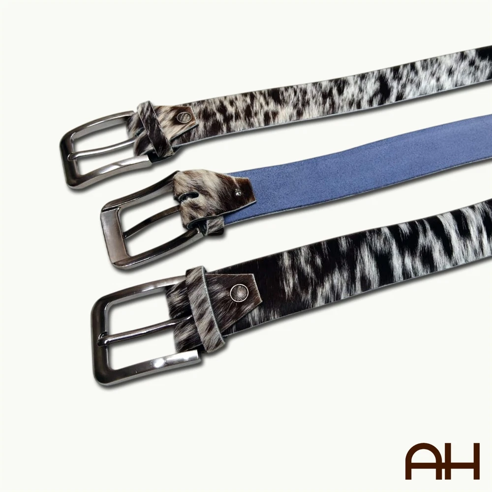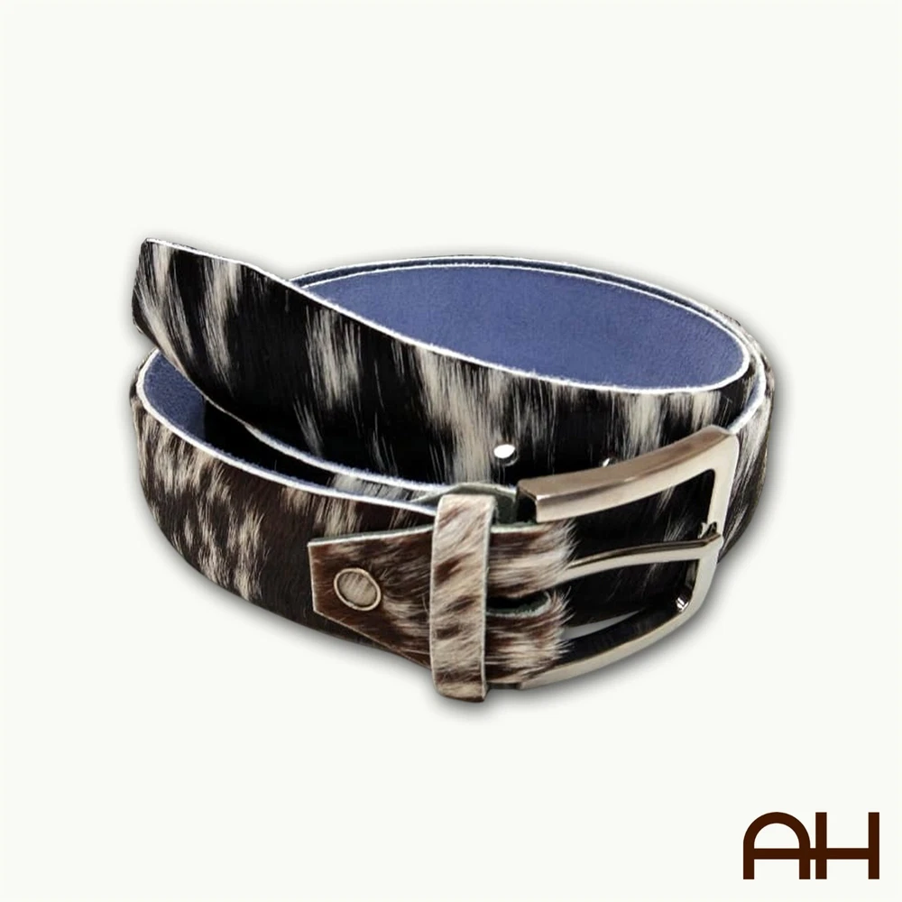 New AH Leathers Cowboy Style Real Cow Hair Leather Belt Men & Women Handmade USA White & Black Fur Made in the USA, by AH Leathers Craftsman, from one solid piece of Buffalo Hide Leather Black Color Elevate your style with our Cowboy Style Genuine Hair On Leather Belt, perfect for both men and women. This belt is crafted from 100% natural hair-on leather, offering a unique and sophisticated look. Each belt is handmade with high-quality materials, ensuring durability and timeless elegance. The solid brass removable buckle adds versatility, allowing you to customize your belt easily. Details: Material: 100% genuine hair-on leather with premium leather backing Buckle: Detachable and adjustable solid brass buckle Width: 1.5 inches (4 cm) Unique Color Patterns: Each belt is uniquely patterned due to natural hair-on leather Ethically Sourced: Made from ethically sourced materials, ensuring responsible practices Environmentally Conscious: Crafted with a focus on environmental sustainability Suitable for: Both men and women Ideal for: Formal and casual wear Features: Premium Quality: Made from high-quality hair-on leather with genuine leather backing Durable & Stylish: Combines durability with a modern, stylish design Silky Soft & Odorless: Ensures comfort and a pleasant wearing experience Versatile: Perfect width for both jeans and formal attire Adjustable: Multiple holes for easy size adjustment Handmade Craftsmanship: Expertly crafted for superior quality Size: Waist Sizes: Available in 30" to 48" Width: 1.5 inches (4 cm) Adjustable Length: Easily adjustable to fit your waist Buffalo Hide Full Grain Leather Men's Heavy-Duty Belt for work Leather Belt or any occasion. Men's Leather Belts are hand crafted from solid piece of Full Grain Buffalo Leather. Heavy-Duty Roller Buckle attached with heavy duty Chicago screw, to make changing the buckle out for your own personal Buckle easy. Buckle colors available: Stainless steel Handmade from thick 9/10 OZ Buffalo Hide Leather - 1.5" Wide belt. Sizes available: 30" to 52" in length. 7 Hole adjustment, for better fit.
