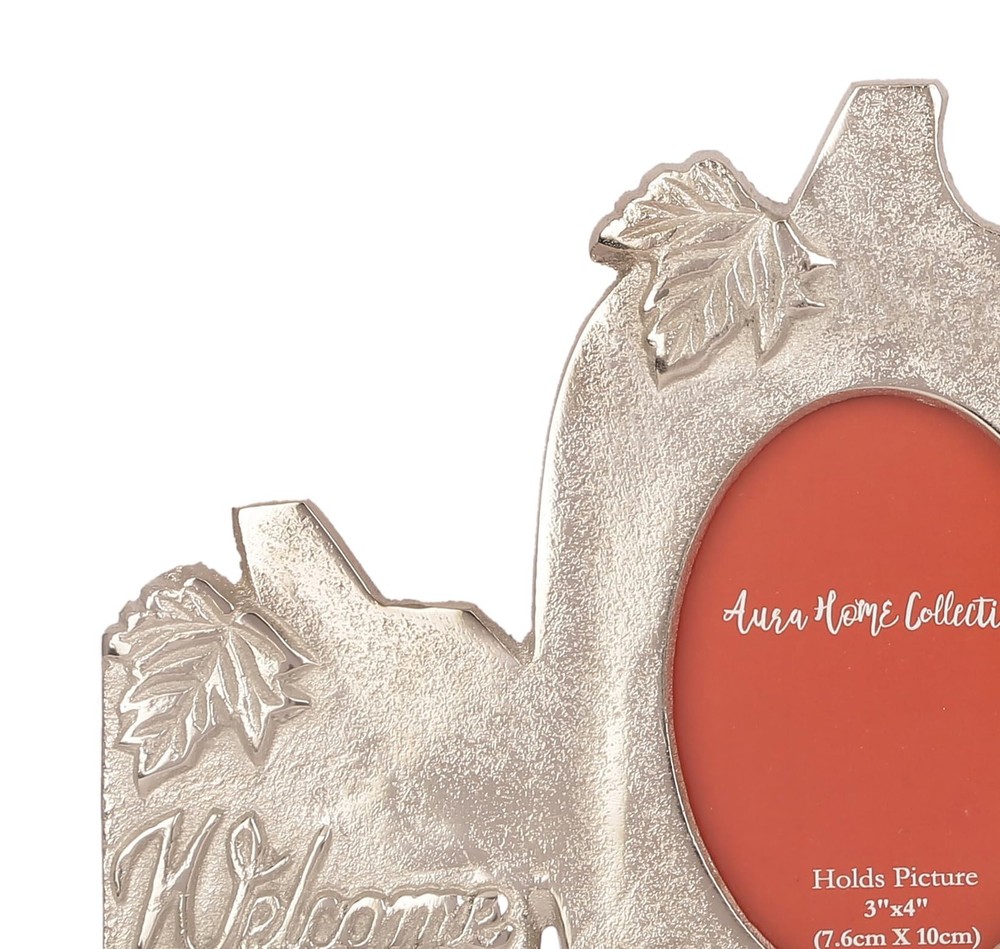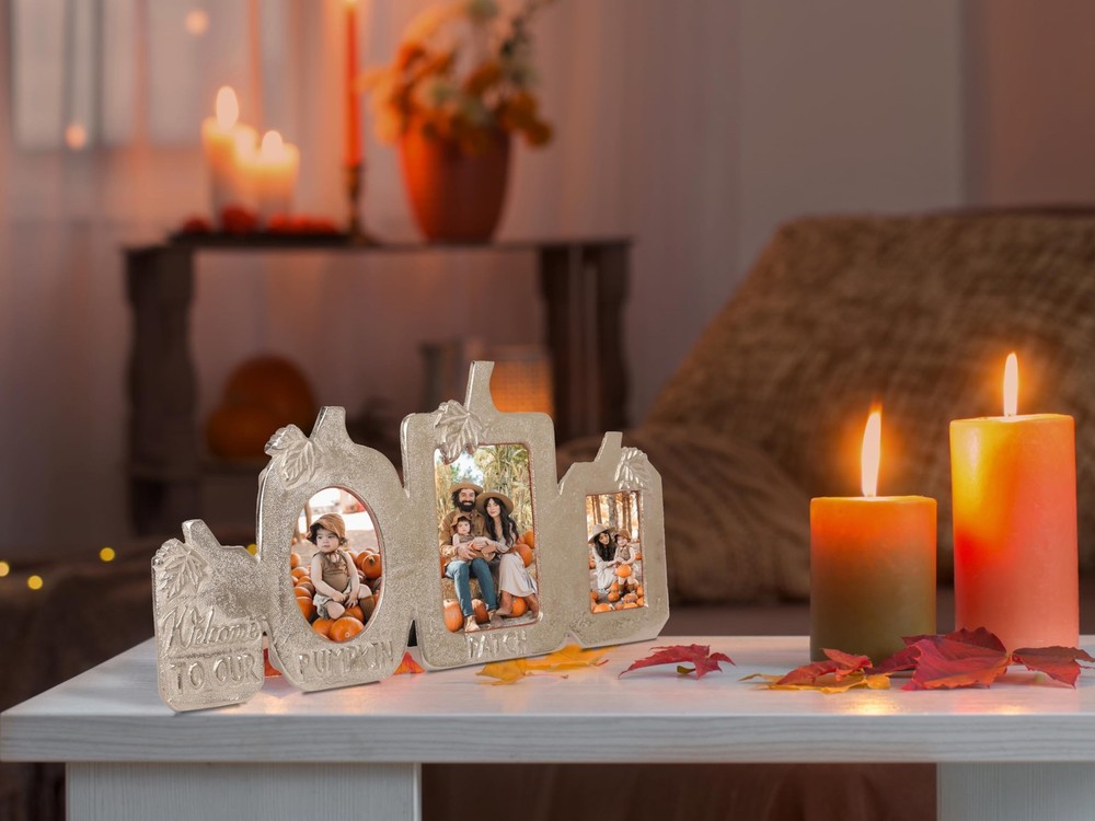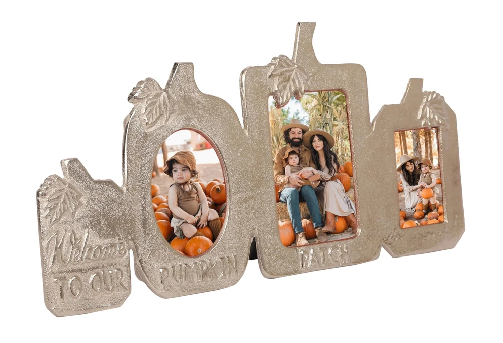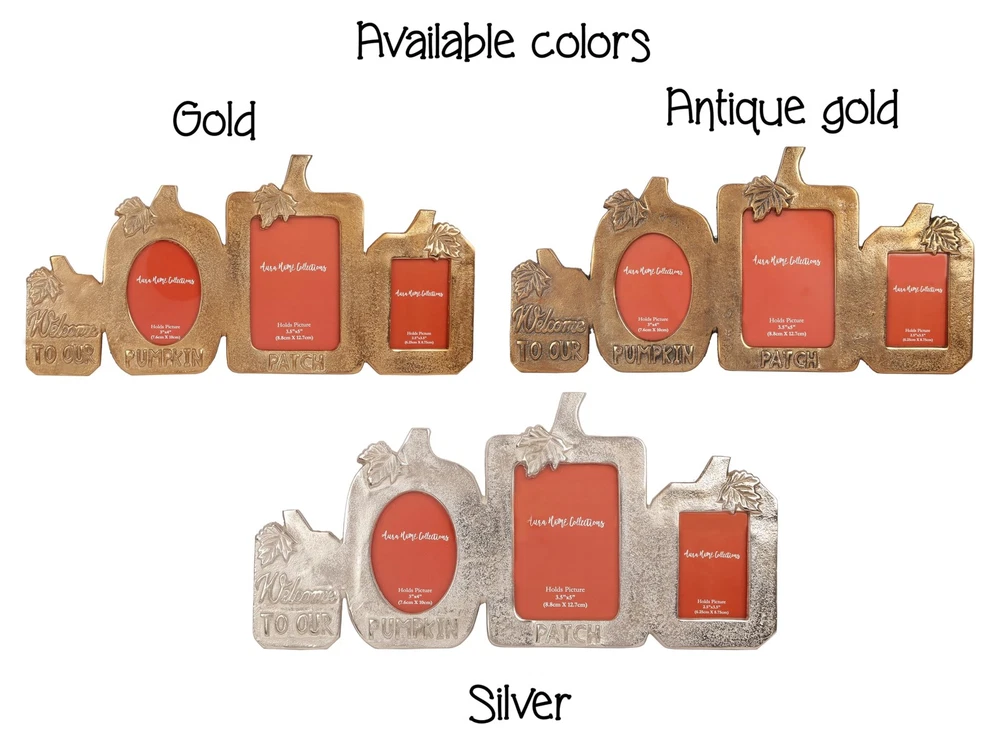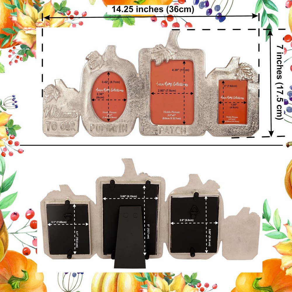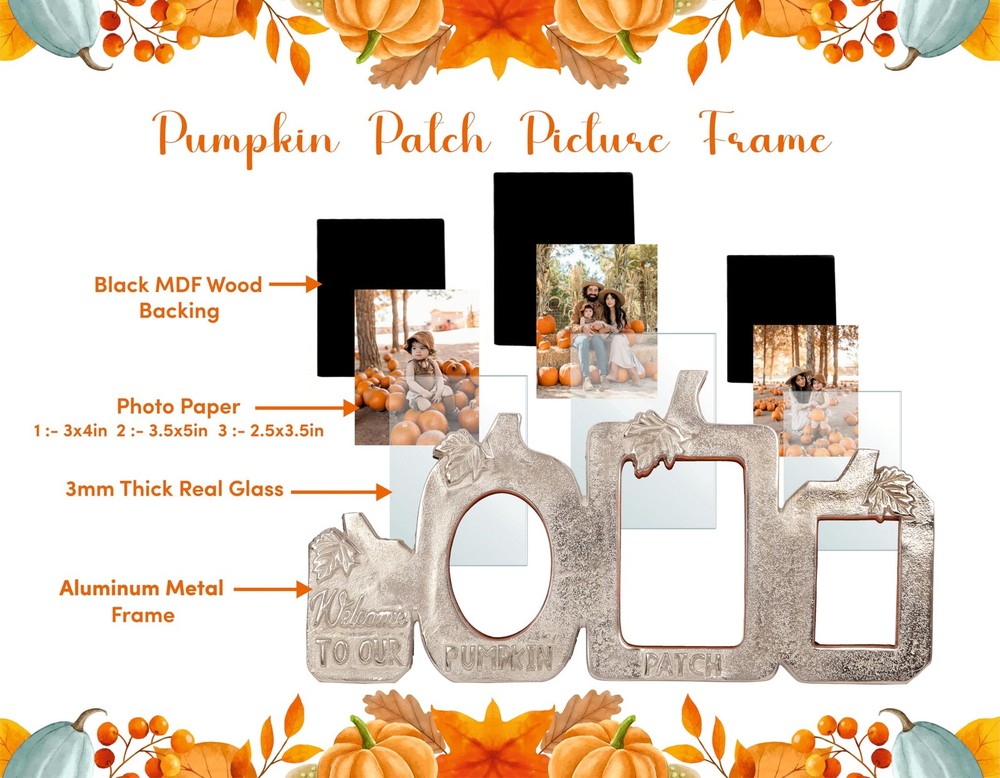 Celebrate the Season with a Touch of Rustic Charm Add warmth and festive spirit to your home with the Pumpkin Patch Picture Frame. Designed in a charming pumpkin silhouette with the heartfelt message "Welcome to Our Pumpkin Patch", this silver-finish 3-in-1 photo frame is perfect for showcasing your cherished memories. Perfect for Fall, Thanksgiving & Halloween Décor Whether you’re decorating for the cozy autumn season, hosting a Thanksgiving gathering, or adding festive touches for Halloween, this unique frame brings seasonal charm to any space. Versatile Display Options Measuring L-14.25" x H-7", it holds three photos: 3"x4" (left) 3.5"x5" (center) 2.5"x3.5" (right) It features a sturdy built-in easel for tabletop use and a triangle ring hanger for easy wall mounting, making it suitable for mantels, shelves, entryways, or gallery walls. Quality Craftsmanship Crafted from durable materials with a textured silver finish, this frame combines elegance and durability—making it a decorative keepsake for years to come. seasonal décor – Celebrate autumn, Thanksgiving, and Halloween with this charming “Welcome to Our Pumpkin Patch” triple photo frame, ideal for adding festive warmth to your home. Holds three photos – Fits 3"x4", 3.5"x5", and 2.5"x3.5" picture, allowing you to showcase multiple cherished memories in frame. Quality craftsmanship – Made from durable aluminum metal with a textured silver finish; each window features 3mm thick, smooth-edged toughened glass for clarity and safety. Versatile display options – Includes a built-in easel for tabletop placement and a triangle ring hanger for easy wall mounting in any room. Thoughtful gift idea – A beautiful keepsake for friends, family, or hosts during the fall season, perfect for living rooms, bedrooms, dining areas, or entryways.