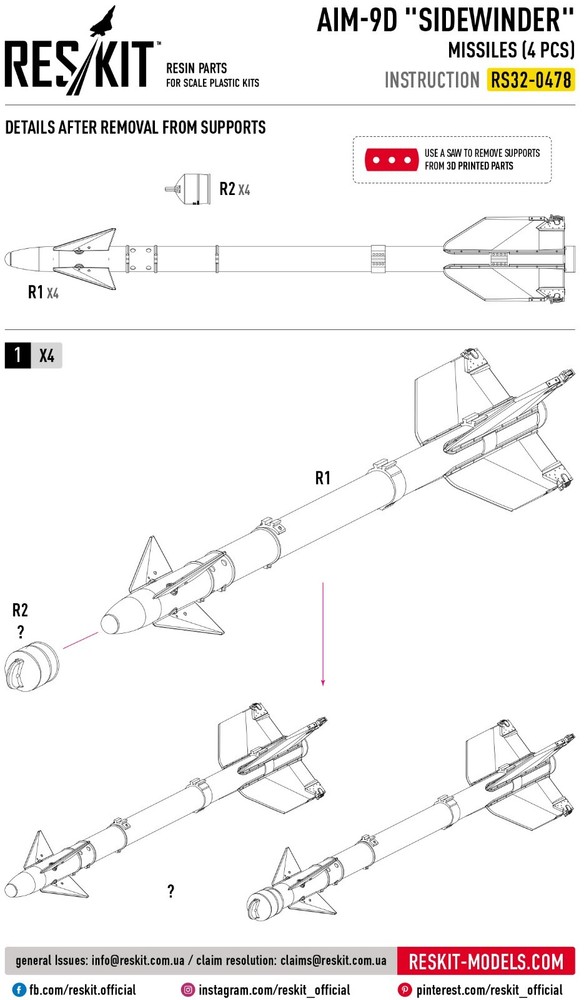 AIM-9D "Sidewinder" missiles (4 pcs) (A-4, A-6, A-7, F-4, F-8, F-100, F-104, F-105, Mirage III) (3D Printed) ResKit RS32-0478 - for Plastic Model Kit Enhance Your Scale Models with ResKit | High-Quality Resin & 3D-Printed Accessories RESKIT - Accessories for Scale Plastic Kits Upgrade your scale model collection with high-quality resin parts from ResKit. Our Ukrainian-made parts are meticulously crafted to provide the most accurate and detailed representation of original components. Whether you're building aircraft, helicopters, military vehicles, or figures, ResKit has the perfect parts to enhance your project. Scale: 1/32 Manufacturer: RESKIT (Accessories for Scale Plastic Kits) Country/Region of Manufacture : Ukraine Condition : New in Box Category: Resin & 3D accessories Type of equipment : Aircraft Type of product: Arms and weapons Recommended kit: Any AIM-9D "Sidewinder" missiles (4 pcs) for aircraft model: A-4 A-6 A-7 F-4 F-8 F-100 F-104 F-105 Mirage III ResKit is a Ukrainian manufacturer of high-quality resin parts and accessories for scale models . The products are distinguished by a high level of detail and accuracy, which allows modelers to create the most realistic models of military equipment, aviation and other objects. Key Features: Premium Quality: Our resin parts are made with the finest materials and precision engineering. Extreme Detail: Experience unparalleled detail and realism in your models. Wide Range: Choose from a vast selection of parts for various scales and subjects. Easy to Assemble: Our parts are designed for easy integration into your existing model kits. Superior quality! ResKit parts allow you to create a model with incredible detail. ---------------------------- >>> Visit our eBay store! <<< You will find everything you need at great prices. Scale model accessories are a wide range of parts, spares, and components that can help you make your model even more realistic and detailed. In our catalog, you will find everything you need to assemble and repair model cars, airplanes, ships, tanks, and weapons. Our accessories are made from high-quality materials and meet all standards. We offer a wide range of models and sizes so you can find what you need. Buy scale model accessories in our store and make your model even more unique!