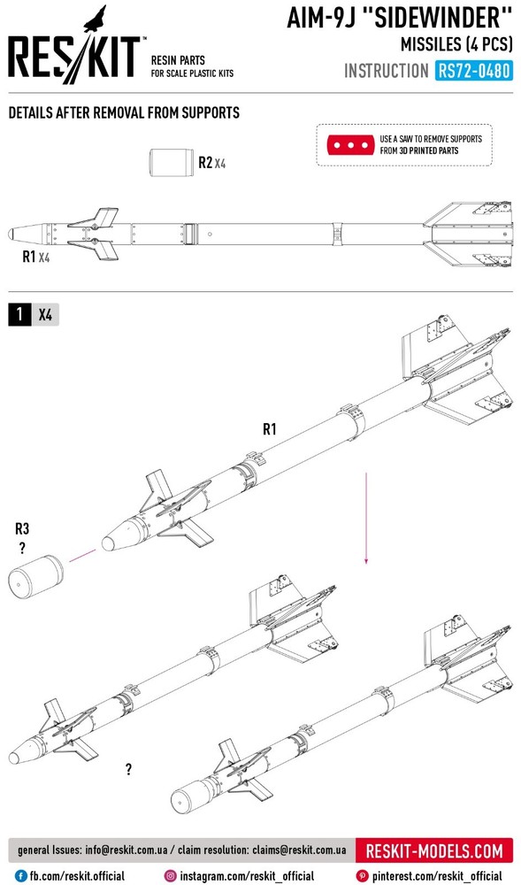 AIM-9P "Sidewinder" missiles (4 pcs) (3D Printed) Scale 1:72 ResKit RS72-0483