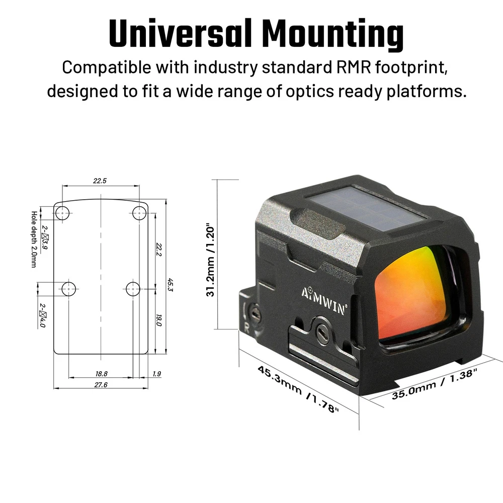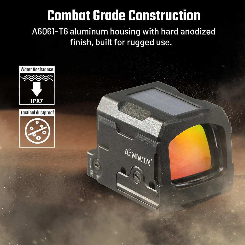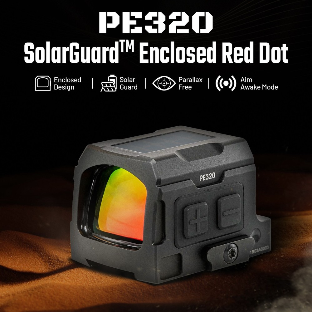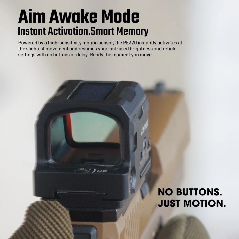 Enclosed Emitter Optic: The AIMWIN PE320 is a rugged enclosed red dot sight engineered for consistent performance in rain, dust, and harsh environments. This reflex sight features a crystal clear oversized window for faster target acquisition and a parallax free design that ensures pinpoint accuracy. The red dot optic emits a 650nm wavelength laser, delivering vivid visibility in any light condition. Built for tactical shooters, this durable optic offers unmatched clarity, stability, and speed 3 MOA Dot & 36 MOA Circle: Combining a precise 3 MOA center dot with a 36 MOA outer circle, this sight delivers faster target acquisition than standard micro optics. Switchable dot, circle, and circle-dot reticles adapt to both close-quarters speed and long-range precision. Built for reliability, the PE320 withstands 2000G shock without losing zero, while its sealed housing offers IPX7 waterproof and dustproof protection for consistent performance in rain, snow, dust, or harsh environments SolarGuard Dual Power Optics: This solar red dot optic features a dual power system combining a CR2032 battery with up to 50,000 hours of continuous runtime and an integrated SolarGuard panel that delivers sustainable power in daylight. The side load battery design allows quick and tool-free battery replacement without removing the sight from your firearm. Whether in training or duty, this long battery life red dot ensures you never run out of power when it matters most 11 Brightness Enclosed Red Dot: This solar red dot sight includes 11 adjustable brightness levels, 9 for daylight visibility and 2 for night vision compatibility, delivering clear aiming in any environment from low-light indoor shooting to direct sunlight. Equipped with Aim Awake motion-activated technology, the sight powers on instantly when movement is detected, ready instantly. Windage and elevation can be adjusted ±50 MOA each, giving a total 100 MOA travel range for precise zeroing. ACRO to RMR Adapter Red Dot Sight: This reflex red dot sight features an ACRO footprint and includes an ACRO to RMR adapter plate, allowing ACRO-style enclosed optics to be securely mounted on slides or plates with standard RMR cut patterns. It provides a simple upgrade path for pistols or rifles without changing the existing mounting system, ensuring wide compatibility across multiple platforms The AIMWIN PE320 Enclosed Sight is a rugged red dot optic with a 3 MOA dot and 36 MOA circle for fast and precise aiming. Its dual power system combines a SolarGuard panel and a CR2032 battery, delivering up to 50,000 hours of runtime with seamless automatic switching. The parallax-free wide window, Aim Awake motion activation, IPX7 waterproofing, and 2000G shock resistance make it ideal for demanding environments. Built for tactical use, this optic is always ready when you are. Features Multi-Reticle System:Switch between 3 MOA dot, 36 MOA circle, and circle-dot configurations to match different scenarios and personal shooting preferences. 11 Brightness Levels:Includes 9 daylight settings and 2 night vision modes for flawless clarity in any light condition. SolarGuard Power System:Combines a CR2032 coin battery with a solar panel for uninterrupted operation day or night. Aim Awake Motion Activation:Automatically powers on the optic when motion is detected for instant readiness. Parallax-Free & Large Viewing Window:The 24 × 20mm window offers a wide field of view with parallax-free precision. Built to Last:Constructed from hard-anodized 6061-T6 aluminum and tested for IPX7 waterproofing and 2000G impact resistance. Specifications Dot Size& Circle Size:3 MOA & 36 MOA Reticle Color:Red (650nm wavelength) Magnification:1× Parallax:Parallax-Free Brightness:11 Levels (9 Daylight + 2 Night Vision) Adjustment per Click:1 MOA Windage & Elevation Range:±50 MOA per axis (Total 100 MOA) Window Size:24.0mm × 20.0mm (0.94” × 0.79”) Material:6061-T6 Aluminum with Hard-Anodized Finish Footprint Compatibility:RMR to ACRO Adapter Plate Included Dimensions:45.3mm × 35.0mm × 31.2mm (1.78” × 1.38” × 1.2”) Weight:62g (2.19 oz) Waterproof Rating:IPX7 Shock Resistance:Rated to 2000G Operating Temperature:-30°C to 60°C (-22°F to 140°F) Accessories