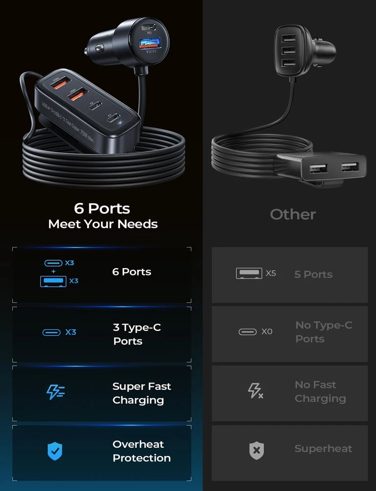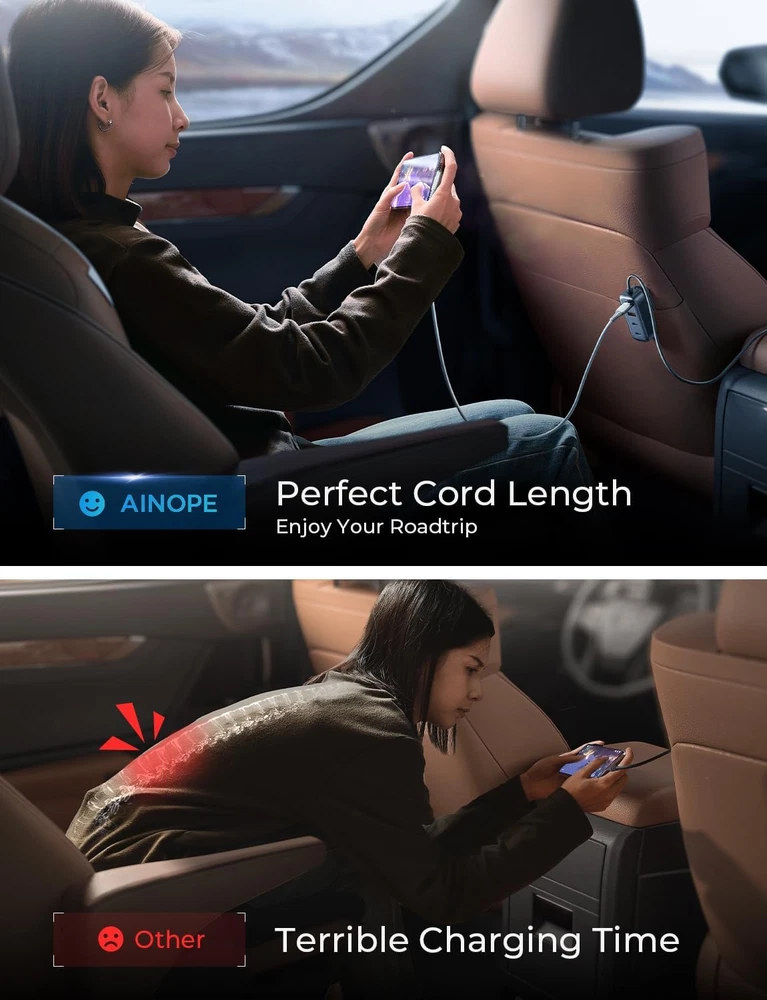 Store New Arrivals Add to Favorite View Feedback Contact AINOPE Car USB Charger Multi Port, 108W Fast USB C Car Charge PD 36W & QC3.0 Description Item model number 2E78 Manufacturer AINOPE Mounting Type Back Clip Color Black Brand AINOPE Connector Type USB Type C 3 PACK, USB Type A 3 PACK Compatible Devices Smartphones, Game Consoles, Tablets, Cameras, Smartwatches Item Weight 5.6 ounces Connectivity Technology USB Input Voltage 12 Volts Compatible Phone Models Google Pixel Special Feature Fast Charging Package Dimensions 6.1 x 4.33 x 1.46 inches Included Components car usb charger multi port 108W 6 port 【30mins Super Fast & 3 Type-C Ports】The 2024 latest upgrade Car USB charger Multi Port cigarette lighter USB charger has 3 PD3.0 Type C ports. Charging 3 devices simultaneously does not result in slow charging. The driver's side 36W USB car charger can charge your iPhone 14 from 0-80% in just 30 minutes. The backseat PPS 20W car charger USB-C can charge Samsung S24, S23, S22 from 0% to 80% in just 35 minutes, which is 5 times faster than a standard USB-C car adapter. It is suitable for all USB devices to meet super charging requirements. 【Upgraded 108W 6-Ports Car Charger】The 2024 upgraded fast charging USB car charger with 6 ports USB outputs includes 2 ports (36W USB-C + 18W USB-A) for the cigarette lighter adapter, providing PD 36W & QC 3.0 for the driver's side Car USB Charger Multi Port. Additionally, it features 4 ports (230W Type-C + 218W USB-A) with a 5FT extension coiled cable for back seat car charging. Designed for family and big group charging simultaneously, it powers up all devices in your car at once. It's the perfect car charger adapter for cars, SUVs, trucks, and all 12V~24V vehicles. 【6-Port for Family & Simultaneous Charging】AINOPE 6-port USB-C car charger fast charging is designed for family and big group charging simultaneously, powering up all devices in your car at once. The back clip is designed to help you hang or secure the car charger in the back seat pockets. Perfect for when you have kids in the backseat fighting over the Car USB Charger Multi Port! Everyone kept their electronics charged without fighting to share cords. 【Wide Compatibility】This car charger is compatible with all electronic devices, such as iPhone, Samsung Galaxy, Google Pixel, all smartphones, iPads, AirPods, wireless charger, Nintendo Switch, camera, and other equipment. Universal for 12-24V vehicles, it adapts to mainstream vehicle types such as cars, SUVs, trucks, RVs. 【Safe & Multiple Charging Protections】This Car USB Charger Multi Port is made of ABS&PC fireproof material, with a built-in intelligent chip that can automatically identify devices plugged in and distribute the optimal charging efficiency. It protects electronic devices from over-current, over-charging, over-heating, and short-circuiting. This multi-USB car charger with UL report has passed multiple safety tests, ensuring safety during the entire driving process. Car Travel Essentials for Long Trips:equipped with 6 charging ports, ensuring that all passengers in the vehicle have access to charging. Therefore, there will be no quarrels over charging ports. With this product, you can enjoy a peaceful car interior environment, even if you have three children, they can remain calm and quiet. Product Description AINOPE 6 Port USB Car Charger The Best Car Charger For Family & Friend Roadtrip Real Super fast charging for three devices simultaneously when using three USB-C ports at the same time Total Power rate up to 108W(1*36W Front USB-C, 2*30W Back USB-C) Brought peace to your family car rides, No fighting over who's turn it was to charge their phone 6 Ports Fast Charging Car Charger with 5FT Extension Cable iPhone Series iPhone16 Pro/iPhone 16 Pro Max/iPhone 16/ iPhone 16 Plus / iPhone15 Pro/iPhone 15 Pro Max/iPhone 15/ 14 Pro/iPhone 14 Pro Max/iPhone 14/iPhone 13/ iPhone 13 Pro Max/ iPhone 13 Pro/ iPhone 13 Mini/ iPhone 12 5G/ iPhone 12 Pro/ iPhone 12 Pro Max/ iPhone 12/ iPhone 12 Mini/ iPhone 11 Pro/ iPhone 11 Pro Max/ iPhone 11/ iPhone SE (2nd Gen)/ iPhone X/ XS/ iPhone XS Max/ iPhone XR/ iPhone 8 Plus/ 7 Plus/ iPhone 8/ 7/ iPhone 6 Plus/ 6s Plus/ iPhone 6 / 6s/ iPhone 5/ 5s / SE (1st Gen) Samsung Series Samsung Galaxy S24/ S23 / S22 5G/S21 5G/ S21+ 5G/ S21 Ultra 5G/ S20/ S20+/ S20 Ultra 5G/Z Fold 4/Z Flip 4/Z Fold 3/Z Flip 3/Note20/ Note20 5G/ Note20 Ultra 5G/ Note10/ Note10+/ S10/ S10+/ S10E/ S9/ S9+/ S8/ S8+/ Note 8/ S7/ S7 Edge/ S6/ S6 Edge/ S5/ S4/ A32 5G/ A70s/ A20s/ M30s/ M10s/ A90 5G/ A30s/ A50s Motorola Series Moto G Stylus 5G/Moto G/Moto G Power/Moto G71s/G82/G52/G22/E32/Moto Edge 30/30 Pro/X30/S30/Moto Tab G70/Moto G200 5G/G71 5G/G51 5G/G41/G31/mOTO e30/G Pure/E40/Tab G20/G60/E20/G 50 5G/Moto Edge/Edge 20 Fusion/Moto G60S/Moto Edge 20 Pro/Edge 20/Edge 20 Lite/Moto one 5G UW cae/Moto Defy/Moto G100/G50 Other Phone Google Pixel 9 / 8 / 7 / 6 pro/6/5/ 4A 5G/ 4A/ 4 XL/ 4/ 3a XL/ 3a/ 3 XL/ 3/ 2/ 2 XL/ XL, Google Nexus 6P / 6; TCL, Xiaomi, Lenovo, LG, HUAWEI, SONY, HTC, Xperia, Nokia Other Devices iPad/ MacBook/ Wireless Charger/ Nintendo Switch/ GPS/ Driving recorder/ Navigator/ Car Humidifier/ Car Vacuum Cleaner/ Bluetooth Speaker/ Headphones/ Kindle/ Tablets Parameters for the front seat 1* 36W USB-C Port ; 1* 18W USB-A Port Parameters for rear seats 2 * 36W USB-C Port ; 2 *18W USB-A ABOUT US We offer the best prices around on high quality products. Our E-store includes media such as books, movies, music and games while offering electronics, toys, sporting apparel, clothing, tools, general home, garden items and more. SHIPPING We are always working hard to ensure your package arrives as soon as possible. Please understand that some factors like weather, high postal traffic, and the performance of shipping companies are outside of our control. We offer free shipping to the lower 48 states and ship within 2 business days of payment, usually sooner. We do not accept P.O. Boxes. Please provide a phys
