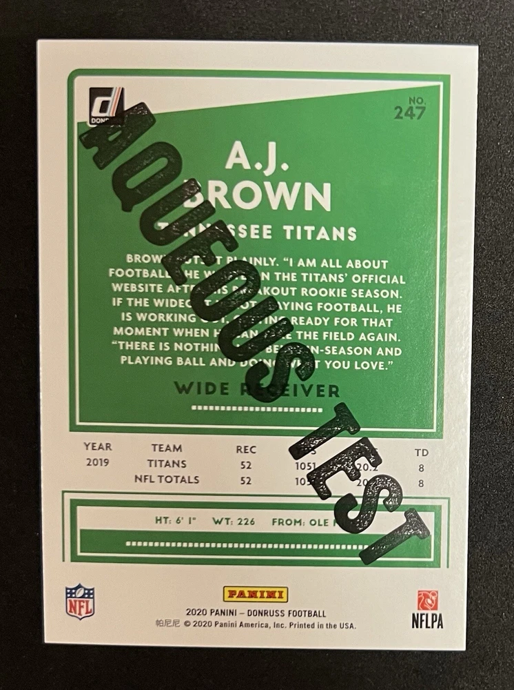 Sport: FOOTBALL Team: Tennessee Titans Set: 2020 Donruss Autographed: No Type: Sports Trading Card Player/Athlete: A.J. Brown Season: 2020 League: NFL Card Number: 247 Manufacturer: Donruss Year Manufactured: 2020