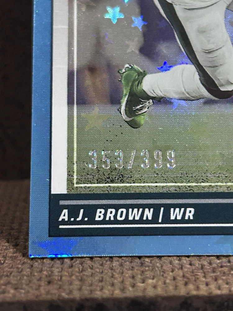 Features:Parallel/VarietySet:2024 ScoreSeason:2024Sport:FootballPlayer/Athlete:A.J. Brown, Patrick Mahomes II, Patrick Mahomes, Jayden Daniels, Jalen Hurts, Josh AllenLeague:National Football League (NFL)Team:Philadelphia EaglesPrint Run:/399Parallel/Variety:StarsManufacturer:PaniniCard Number:353Autographed:NoType:Sports Trading Card