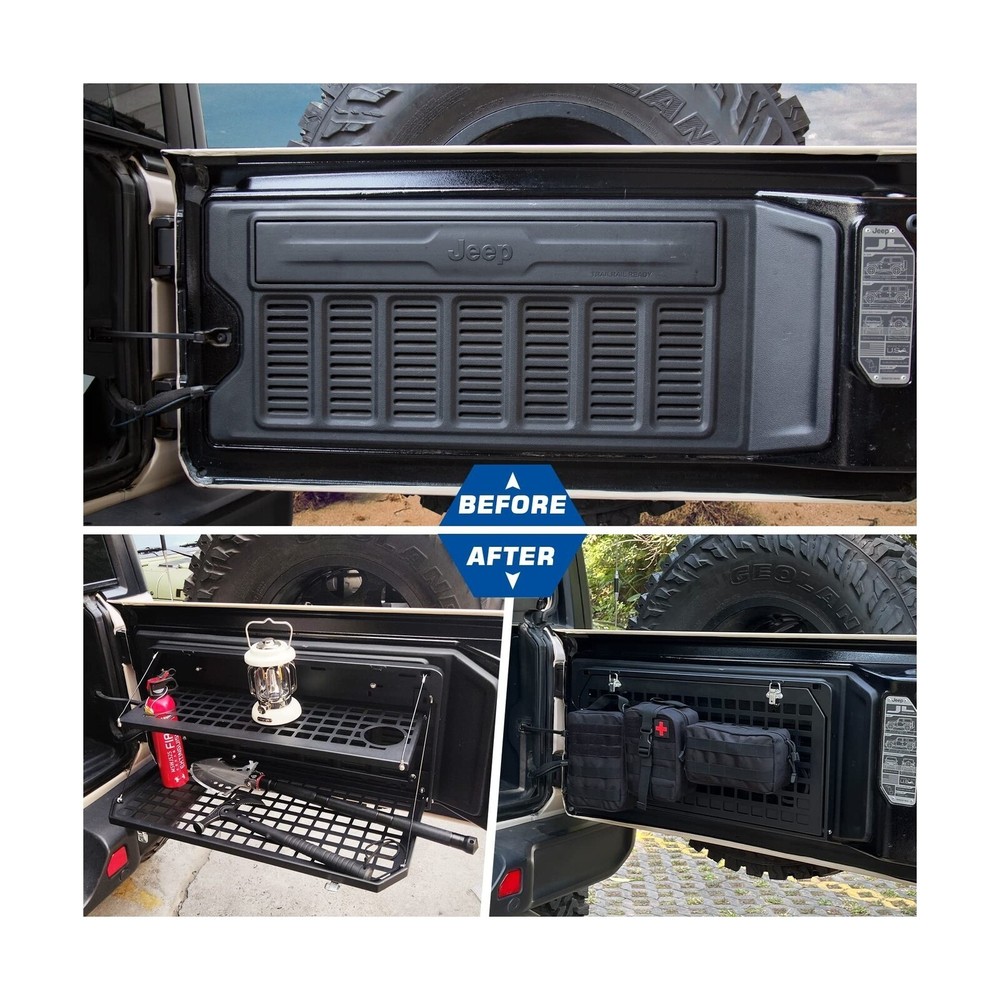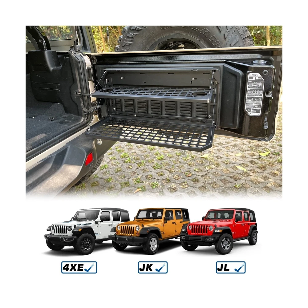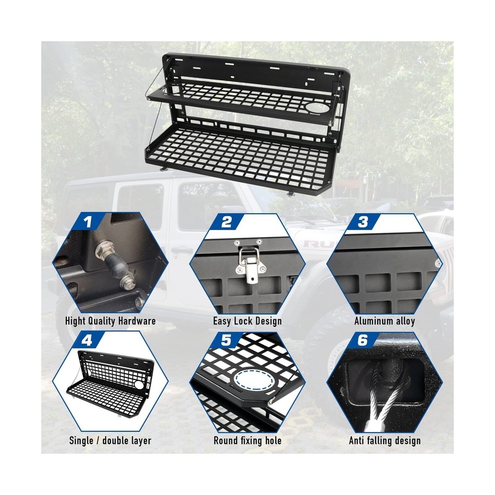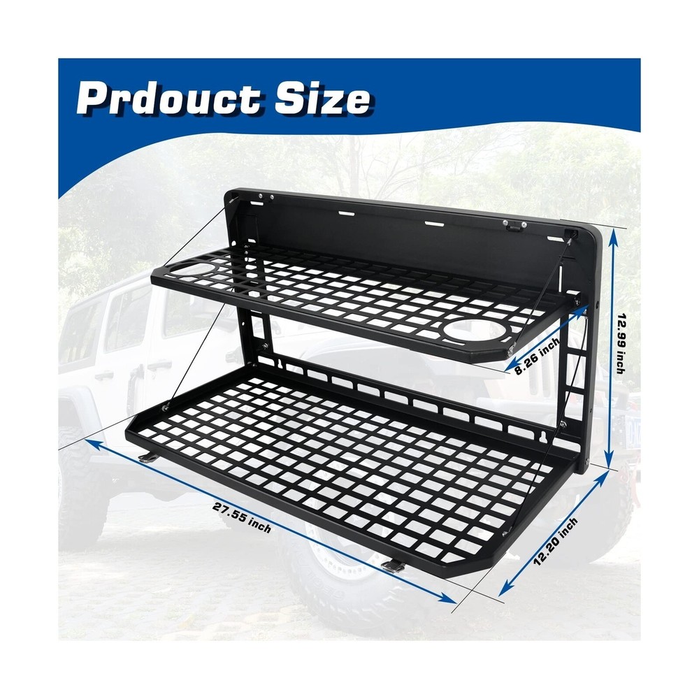 AL4X4 2-Tier Tailgate Table Rear Foldable Storage Cargo Rack Outdoor Camping Desk for 2007-2022 Jeep Wrangler JK&JL 4 Door (Not Fit JK Models with Stock Subwoofer) Description Features: Perfect FitmentOutdoor Camping Storage Tailgate Table suitable for Jeep Wrangler JK JKU & JL JLU 2007-2022 4 Door.(Will not fit with stock subwoofer on jk models) Installation NotesEasy to install, no drilling or cutting required for installation on JK, just screw on, simple drilling is required for installation on JL, relevant instructions are attached or For details, please check the video on the picture Double-Layer DesignTailgate Table has two large levels providing plenty of workspace to prepare your meal and even provides enough room to even hold a grill for your next overland adventure or tailgate party. Easy foldable design to save space High Quality MaterialThe Cargo Rack made of high quality aluminum alloy. Black textured powder coat for durability and corrosion protection, withstand a weight of 100 lbs can be competent for daily computer office and cooking MOLLE System After folding, the whole table will become a molle panel.This panel can hold molle pouches, tools, fire extinguishers and anything you can think of that fits into a MOLLE system Product Details: Manufacturer: ‎‎AL4X4 Brand: ‎FUNY Model: ‎Tailgate Table Item Weight: ‎14.87 pounds Package Dimensions: ‎29.3 x 14 x 2.5 inches Country of Origin: ‎China Item model number: ‎AL19044 Manufacturer Part Number: ‎Tailgate Table Date First Available: February 13, 2023 Delivery We Do Not Ship Outside of the Continental US. Return Policy All items qualify for returns within 30 days of receipt. Buyer is responsible for return shipping on any item that is not damaged. Feedback We take our reputation seriously, we buy and sell online, so we understand the value of trust. If you are unsatisfied with your order, please contact us and we will work with you to resolve it to your satisfaction.