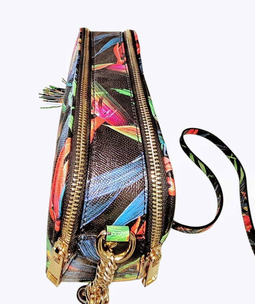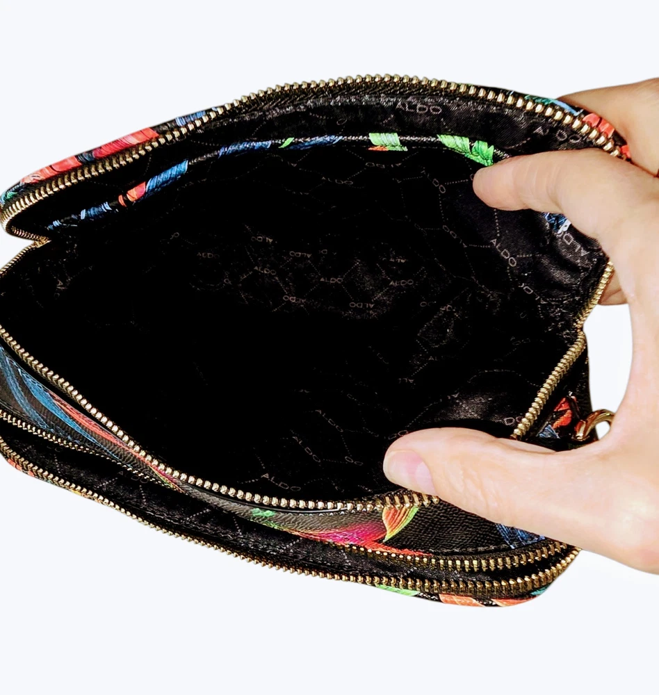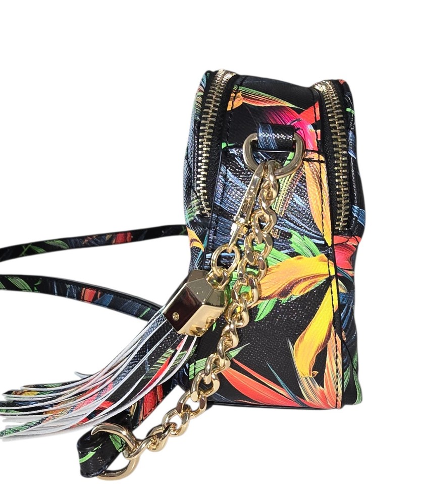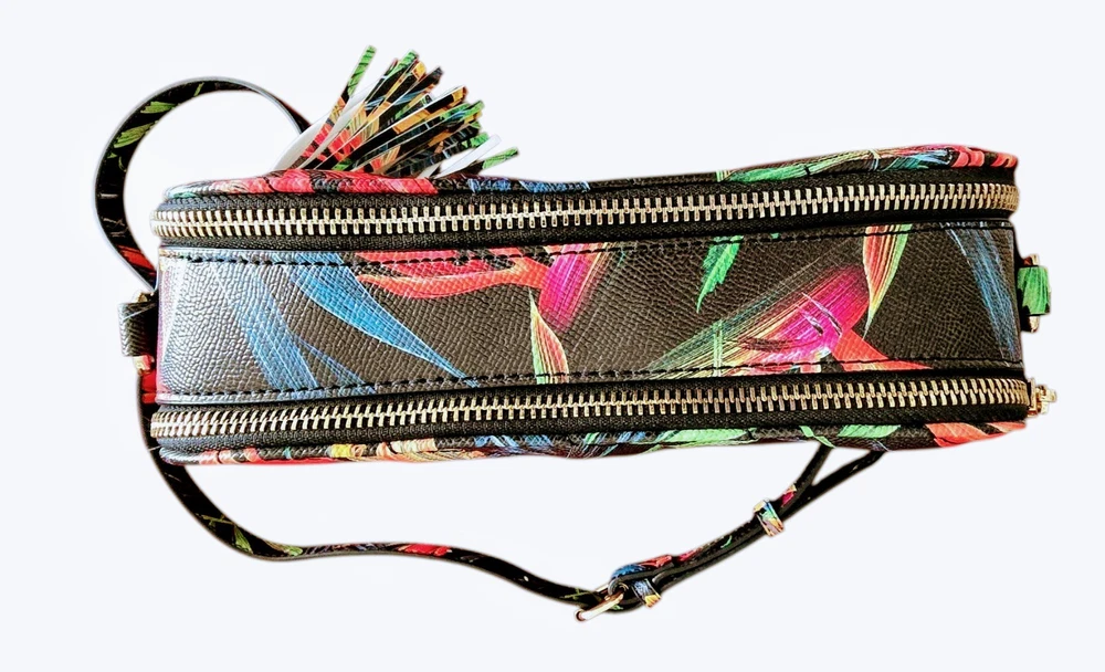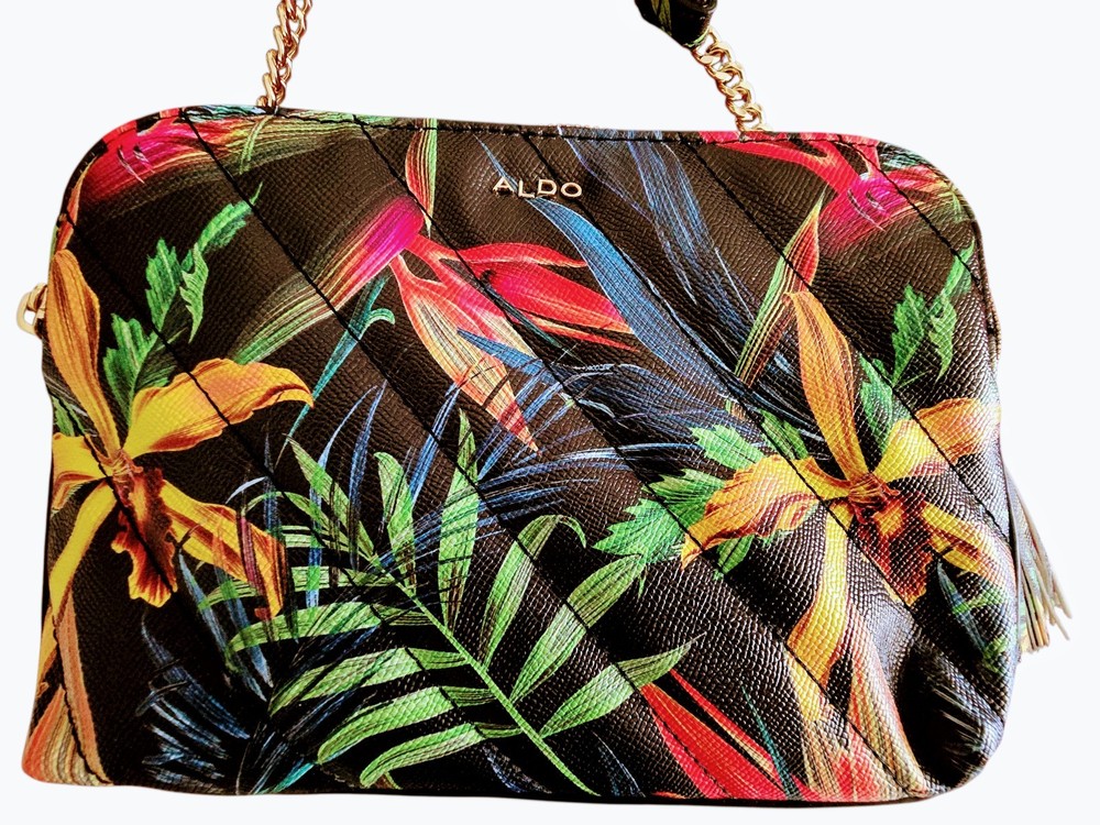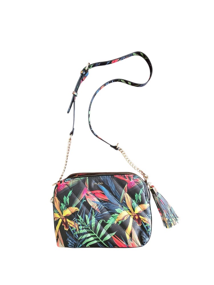 ALDO Tropical Crossbody Bag NWOT – Floral Print, Double Zip, Tassel, Chain Strap Condition: New Without Tags – Never Used Bold and stylish ALDO crossbody bag with a vibrant tropical print. Features two zippered compartments, gold-tone hardware, a decorative tassel charm, and an adjustable strap with a chain accent. Compact and lightweight—perfect for everyday or summer getaways. • Dimensions: 9" W x 6" H x 2.75" D • Material: Polyurethane exterior / Polyester lining • Color: Multicolor on black background • RN 82884 / CA 14383 💡 Ships fast from a smoke-free home. 💬 Happy to answer any questions!