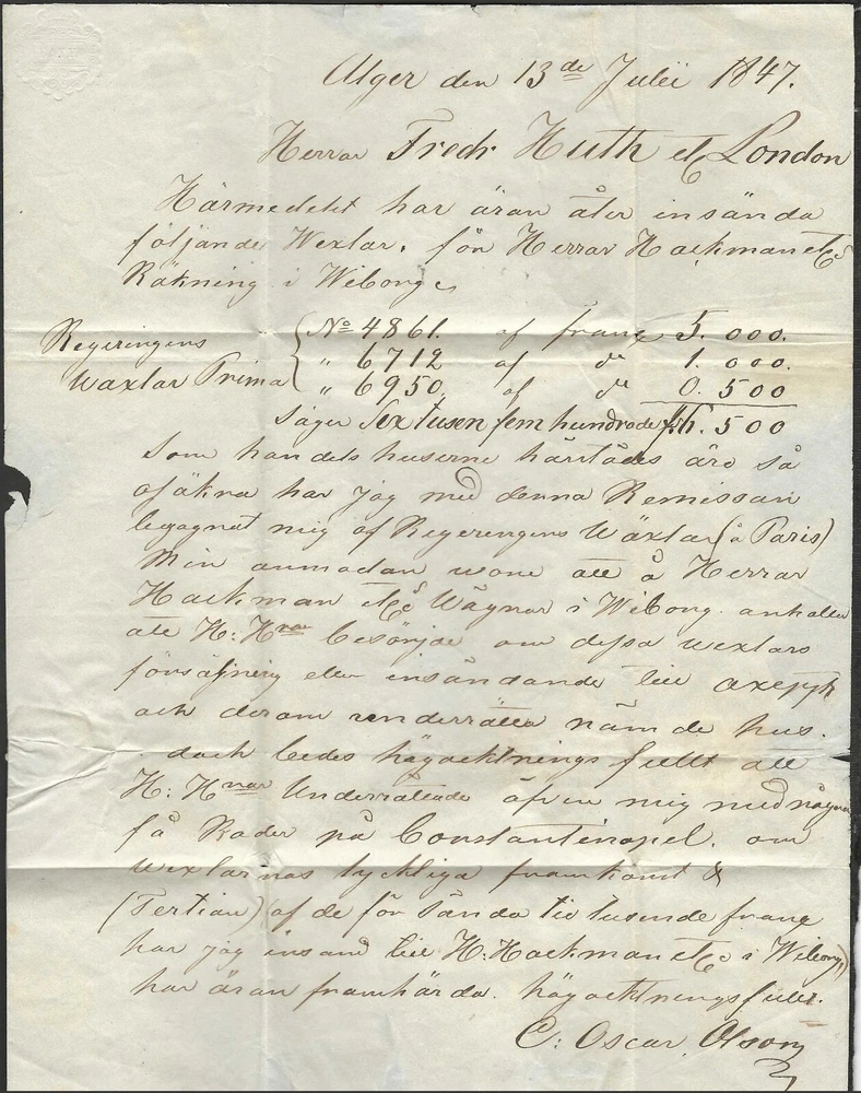 ALGERIA FRANCE 1847 EARLY FREE FRANK FOLDED LETTER ALGER TO LONDON WRITTEN IN SWEDISH BY OSCAR OLSON VIA HAMBURG FRANCE PLEASE VISIT MY EBAY STORE : Filatco Stamps BUY 5 ITEMS SHIPPING & REGISTRATION IS FREE INTERNATIONAL BUYERS PLEASE NOTE: EBAY AND PAYPAL REQUIRE REGISTRATION FOR TRACKING INTERNATIONAL SHIPMENTS. EBAY CHARGES $12.61 FOR SHIPPING LABELS WITH TRAKING # US POST OFFICE CHARGES $14.95 FOR REGISTRATION # + POSTAGE BUYER HAS THE CHOICE OF SHIPPING FIRST CLASS MAIL WITHOUT TRACKING # FOR $2.50 . IN THIS CASE BUYER ACCEPTS RESPONSIBILITY IF ITEM IS LOST IN TRANSIT. Feel free to ask if you have any questions. PAYMENT WITHIN 2 DAYS IS APPRECIATED . FEEDBACK : I APPRECIATE YOUR BUSINESS AND MY TOP CONCERN IS TO MAKE SURE YOU ARE 100% PLEASED WITH ANY ITEM YOU PURCHASE. IF YOU HAVE A CONCERN OR A PROBLEM WITH INVOICE, SHIPPING OR ANY ITEM YOU RECEIVED PLEASE CONTACT ME FIRST BEFORE YOU LEAVE ANY FEEDBACK. I GUARANTEE YOU WILL BE 100% SATISFIED WITH THE TRANSACTION. I WILL CERTAINLY LEAVE YOU A POSITIVE FEEDBACK AS SOON AS I RECEIVE YOURS.