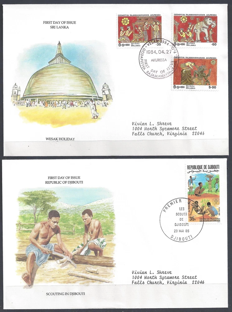 ALGERIA-MOROCCO-SOMALIA-COMORES DJIBOUTI-PAKISTAN-MALAYSIA SRI LANKA 1980's COLLECTION OF 8 FDC's ALL WITH LIMITED EDITION CACHETS PLEASE VISIT MY EBAY STORE : Filatco Stamps BUY 5 ITEMS SHIPPING & REGISTRATION IS FREE INTERNATIONAL BUYERS PLEASE NOTE: EBAY AND PAYPAL REQUIRE REGISTRATION FOR TRACKING INTERNATIONAL SHIPMENTS. THE US POST OFFICE CHARGES $11.50 FOR REGISTRATION BY BIDDING ON THIS ITEM YOU AGREE TO PAY THE REGISTRATION FEE OF $11.50 IF THE VALUE IS $50.00 OR MORE Feel free to ask if you have any questions. PAYMENT WITHIN 7 DAYS IS APPRECIATED . SHIPPING TO DOMESTIC BUYERS: EXCEPT FOR LARGE ITEMS ALL SHIPMENTS ARE INVOICED $1.50 FLAT FEE SENT USPS FIRST CLASS. ITEMS OF A VALUE OVER $50.00 WILL HAVE INSURANCE ADDED TO THE INVOICE. SHIPPING TO INTERNATIONAL BUYERS : EXCEPT FOR LARGE ITEMS ALL SHIPMENTS ARE INVOICED A FLAT FEE OF $2.50. ITEMS OF VALUE OF $ 50.00 OR MORE FOR CERTAIN COUNTRIES BIDDERS MUST CONSIDER PAYING REGISTRATION FEES BEFORE BIDDING . US REGISTRATION FEES ARE $11.50 + 2.50 FOR POSTAGE. PLEASE CONTACT ME AND MENTION THE COUNTRY IF YOU HAVE ANY QUESTIONS ABOUT INVOICE AND SHIPPING COSTS. FEEDBACK : I APPRECIATE YOUR BUSINESS AND MY TOP CONCERN IS TO MAKE SURE YOU ARE 100% PLEASED WITH ANY ITEM YOU PURCHASE. IF YOU HAVE A CONCERN OR A PROBLEM WITH INVOICE, SHIPPING OR ANY ITEM YOU RECEIVED PLEASE CONTACT ME FIRST BEFORE YOU LEAVE ANY FEEDBACK. I GUARANTEE YOU WILL BE 100% SATISFIED WITH THE TRANSACTION. I WILL CERTAINLY LEAVE YOU A POSITIVE FEEDBACK AS SOON AS I RECEIVE YOURS. Powered by eBay Turbo Lister The free listing tool. List your items fast and easy and manage your active items.