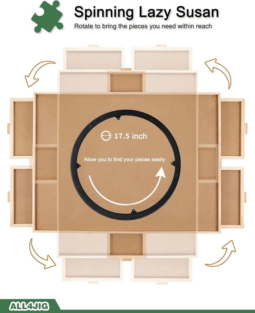 ALL4JIG 2000 Pieces Rotating Puzzle Board with 6 Drawers and Cover,29.6"x41.3"Portable Wooden Jigsaw Puzzle Table for Adults,Lazy Susan Spinning Puzzle Boards Birthday Gift for mom 【High Quality Puzzle Board】Our 2000Pcs most jigsaw puzzle board for puzzle storage is made of premium sustainable hardwood and good manufacturing, durable material ensure long-lasting usage, which is aim to provide the best puzzle table for everyone who love puzzles as we do! Smooth and non-slip surface offer a wonderful area for assembling your favorite jigsaw puzzles with your friends or families. 【6 Drawers & Protective COVER】6 SLIDING DRAWERS allow you to sort your pieces by color, theme or border. Keep them categorized while assembling your puzzle.Every drawer is specially designed with Handle, in order to ensure all the drawers are easy opening when using, safely keep the pieces from missing.Featuring a translucent cover to well guard your masterpiece from dust, water and your curious Dr.Cat until the next time you’d like to continue. 【Spinning LAZY SUSAN Design】An enjoyable and efficient way to assemble your jigsaw puzzles with our spinning puzzle table. Finding your pieces with ease,reaching to any section you need, Lazy Susan under create a wonderful swivel system for 360°smooth and steady rotation, triple funny puzzling interaction and strategic stimulation. 【5s Easy to Stow Away & Transport Puzzle】Easy lift, lightweight and balanced for quick storage.You can place your puzzle table onto any surface, countertops, coffee tables, beach blankets or even the floor.When you need an extra space for seating or dining,Just simply cover your puzzle with the puzzle cover,close the drawers and move it away under a couch or bed can your puzzle be well-stored and safely kept easily in a few seconds. 【Ideal Puzzle Gift for Puzzle Enthusiasts】A perfect birthday or holiday gift for teens, seniors or anyone who love puzzles, encourage quality interaction and strategic stimulation while putting together your favorite jigsaws.If sorting before solving is your guilty pleasure, stress no more! Add a puzzle spinner to your cart today! Shipping We offer FREE shipping on all orders! We use a selection of shipping services such as UPS, FedEx, USPS etc. We only ship to the lower 48 states, no APO/FPO addresses or PO Boxes allowed. Local pickups and combined shipping options are not provided at this time. Return You can return a product for up to 30 days from the date you purchased it. Any product you return must be in the same condition you received it and in the original packaging. Please keep the receipt. Payment We accept payment by any of the following methods: PayPal Please pay as soon as possible after winning an auction, as that will allow us to post your item to you sooner! Feedback Customer satisfaction is very important to us. If you have any problem with your order, please contact us and we will do our best to make you satisfied. Contact Us If you have any queries, please contact us via ebay. We usually respond within 24 hours on weekdays. Please visit our eBay store to check out other items for sale! Thank you for shopping at our store.