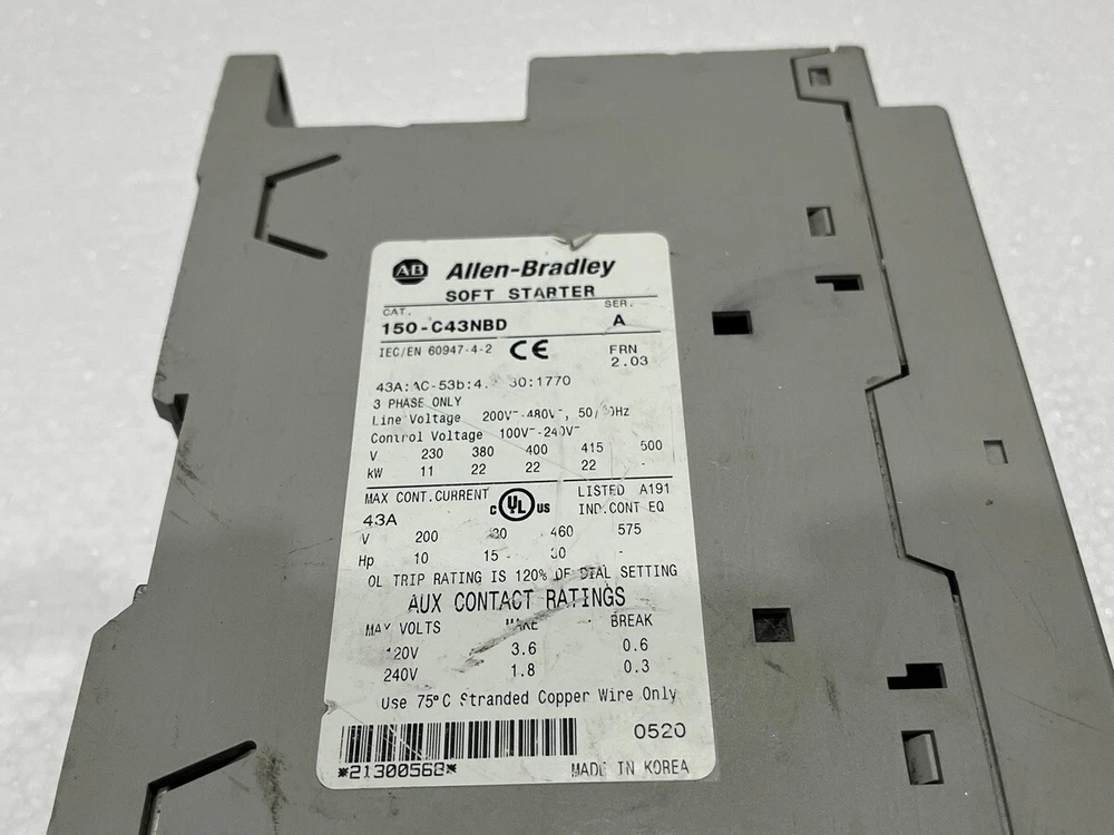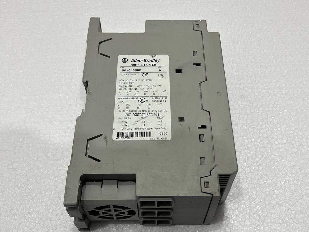 We are pleased to offer ALLEN BRADLEY CAT 150-C43NBD SER A SOFT STARTER Product Detail: ALLEN BRADLEY CAT 150-C43NBD SER A SOFT STARTER MODEL: SMC-3 CAT NO: 150-C43NBD SER: A TYPE: SOFT STARTER Shipment processing time: All orders are processed within 1-2 business days. Orders are not shipped or delivered on weekends or holidays. Shipment confirmation & Order tracking: You will receive a Shipment Confirmation email once your order has shipped containing your tracking number(s). The tracking number will be active within 24 hours. Customs, Duties and Taxes: We are not responsible for any customs and taxes applied to your order. All fees imposed during or after shipping are the responsibility of the customer (tariffs, taxes, etc.). Damages: In case of damage or lost of shipment during transit, We will investigate the matter and provide the satisfactory resolution. Returns Policy: We offer return or exchange of ordered item up to 30 days of receipt of goods in subject to certain condition. In case of damaged goods we shall offer the replacement or refund for the ordered item. If you require any more details, request you to send us the direct message through eBay for early resolution. Thanks