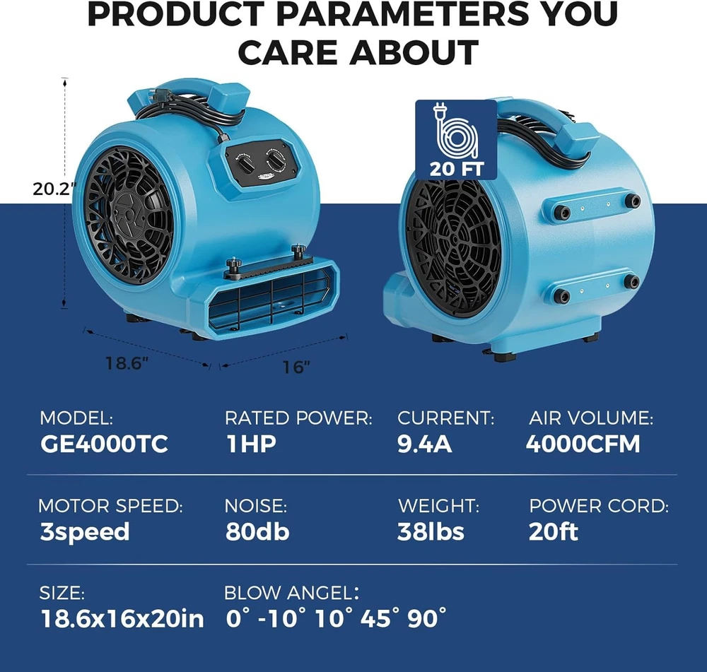 ALORAIR 4000 CFM Air Mover Blower Fan for Industrial, Floor Drying Fan, Carpet Dryer - Timer, Carpet Buckles, Stackable, 20 ft Power Cord, for Water Damage Restoration and Plumbing - GE4000TC Product information Brand ALORAIR Color GE4000TC-Blue Electric fan design Blower Power Source ac Style 4000 CFM Product Dimensions 18.6"D x 16"W x 20.2"H Room Type Bathroom, Home Office Special Feature 20ft. Power Cord, 3-Speed Adjustable Airflow, 5 Operating Positions, Carpet Buckle, Timer Recommended Uses For Product Air Circulation, Drying, Ventilating Wattage 1000 watts Finish Type Painted Air Flow Capacity 4000 Cubic Feet Per Minute Speed 1500 RPM Voltage 120 Volts Item Weight 38.1 Pounds Indoor/Outdoor Usage Indoor Model Name GE4000TC Blue Control Method Push Button Efficiency 4 CFM/W Is Cordless? No Number of Power Levels 3 Manufacturer ALORAIR Size GE4000TC Item Weight 38 pounds Item model number GE4000TC Blue About this item FASTER SURFACE DRYING! - The Alorair GE4000TC Air Mover features an advanced centrifugal design with three adjustable rotational airflow options, ensuring maximum efficiency for fast drying of carpets, floors, furniture, windows, and walls. Up to 4000 CFM airflow, making it ideal for drying flat surfaces and tight areas. VERSATILE FEATURES - 3 speeds and 5 operating positions(0°, 45°, 90°, +10°, -10°) with a built-in 3h/18h timer. Not only is it perfect for air drying, but it also enhances ventilation and increases air circulation in rooms. The carpet clasp secures the carpet to the carpet clasp for quick carpet drying! PROFESSIONAL AND RELIABLE - Designed for commercial and industrial settings, This Alorair air mover includes a 20 ft. long power cord and timer for easy use. Its durable PP housing ensures reliability during large-scale drying, cleaning, and restoration projects. Combine it with Alorair's air scrubbers and dehumidifiers for a comprehensive water damage restoration system. LIGHTWEIGHT AND PORTABLE - Simply plug in the unit to start using it. Stackable and a handle for convenient storage and transportation, whether you're heading to a job site or simply moving it from one room to another. For contractors, restoration specialists, or anyone needing a portable solution, this device offers unmatched portability and convenience. AlorAir is a leading damage restoration company based in California, renowned for its top-tier manufacturing capabilities, professional support team and extensive research and development facilities. Product description