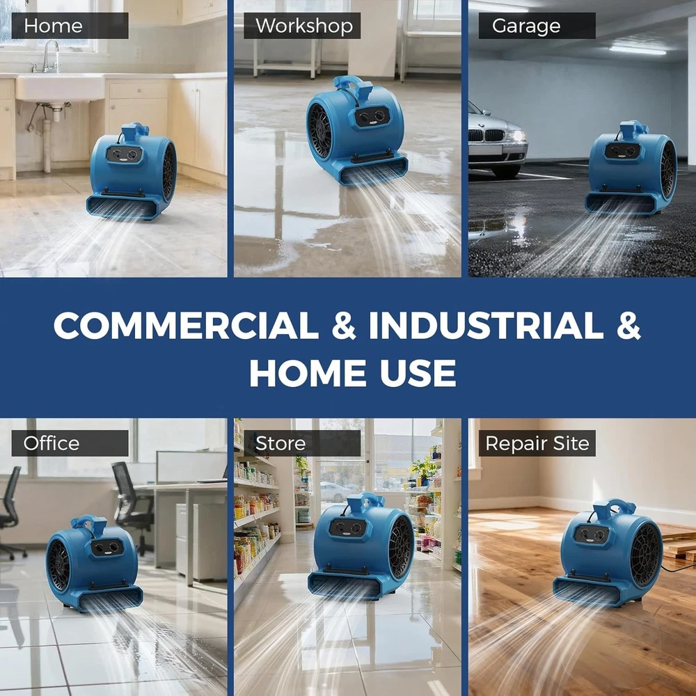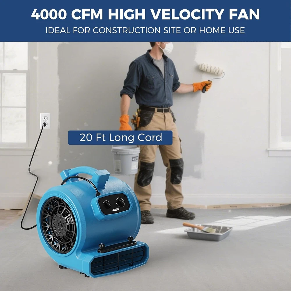 Color: Blue Control Style: Push Button, Rotary Knob, Touch Cable Length: 20 ft Suitable For: Indoor Year Manufactured: 2025 Features: Carry Handle, Stackable, Timer, 5 Adjustable Angles, Carpet Buckles Item Width: 16" Type: Air Mover Power Source: Electric Safety Certification: ETL / CETL Manufacturer Warranty: 3 Years Voltage: 115 V Room: Any Room, Industrial Spaces, Commercial Areas, Construction Sites Model: GE4000TC Applied to: Christmas and New Year gifts Application: Industrial, Workshop, Home, Water Damage Restoration,Plumbing Air Flow Volume: 4000 CFM Item Depth: 18.6" Brand: ALORAIR Number of Speeds: 3 Mounting: Free Standing Item Height: 20.2" Operating Sound Rating: 80 dB Material: Plastic
