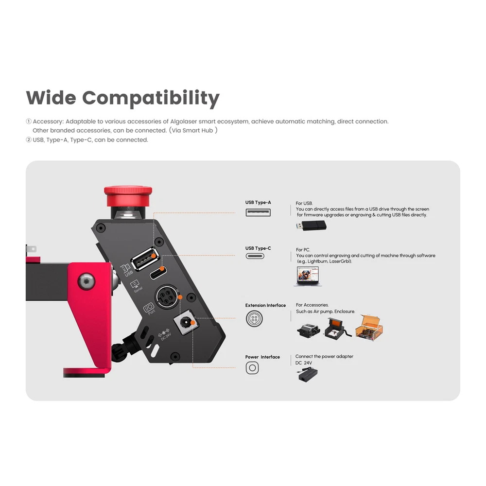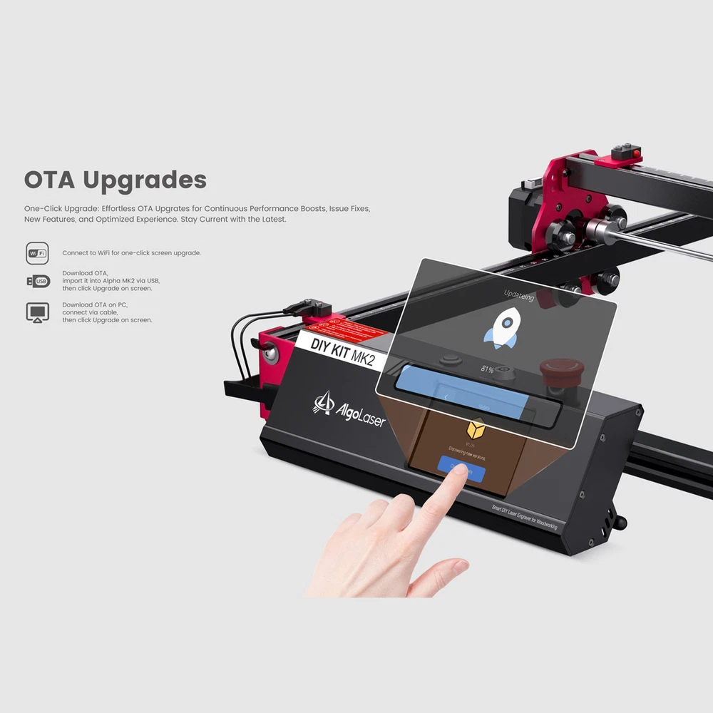 Features: π Ultrafine Laser Point & Powerful Laser Module & Faster Speed: Comes with the latest FAC laser technology for compressed laser point, 0.08*0.1mm Smaller laser spot and ultra-fine lines allow for impeccable details and cutting 4mm Birch Plywood, 5mm Basswood Plywood by one pass. Up to 12000 mm/min speed is and 400*435mm engraving area allows you to product more works at the same time. π Smart Integrated Control: The AlgoOS has built-in Algo Graphics Engine, A 5M JPG image could be processed within 30 seconds, from image to engraving within 1 minute, allowing ordinary users to be free from learning new software. DIY KIT MK2 is compatible with a wide range of Algo smart accessories such as Smart Hub, Heightening Feet, Dustproof Box, Camera or Purifier (purchase separately) for better carving performance. π 3.5'' Colorful Touch Screen: Embedded the screen in the AlgoLaser DIY KIT MK2 laser engraver, it has a friendly user interface and friendly experience. It cut multiple pieces of plywood or images to be engraved without tying up your computer to run it. And support save the Gcode file into TF card and engraving without computer connected. π Safety Protections: Equipped with multiple detections to protect users, which including Emergency Stop Button, Safety Lock, Main Board Overheat Protection, Over-voltage & under-voltage protection; And Laser Goggle and Laser Shield design for enhancing the safety of laser use. π Stable Structure Comes More Powerful Cutting Ability: Following the DIY KIT's design of single motor drive in X and Y directions and 20 profile structure, enabling users to assemble and customize independently. It enhances flexibility and personalization. This lightweight engraver is ideal for DIY enthusiasts and those seeking portability. The machine is well-assembled with 12 screws, no need for complicated belt tightening and other steps to reduce difficulty. π Wide Compatibility: DIY KIT MK2 laser engraver supports offline connection via WiFi-2.4 GHz and TF card (built-in 8G); Supports wired connection via USB Type-A & Type-C; Supports USB stick connection as well. For beginners, AlgoLaser App. LightBurn, and LaserGRBL software provide easy access to offline control and engraving. π Real-Time Detection & Smart Engraving: Adopt "Watchdog" which by monitoring the running status of the CPU and triggering a reset signal when an abnormality is detected, It effectively safeguards the program from getting stuck in an endless loop or running away uncontrollably and improve the stability and reliability of the system. And real-time Light Out Detection, check the status of laser beam, can find and solve problems in time to ensure the engraving quality and equipment stability. Specification: Model: DIY KIT MK2 Machine Size: 668.5*601.5*178mm Product color: black + red Frame material: aluminum alloy Drive mode: X-axis single motor drive, Y-axis single motor drive Engraving stroke: 400*435mm Maximum engraving speed: 12000mm/min Working light power (light source): β₯5000mW(5W) Laser wavelength: 455Β±5nm Focal length: 5mm from the hood Spot size: 0.05*0.1mm Lens material: glass Modulation mode: TTL TTL trigger mode: high-level efficiency (>DC2.0v) Working frequency: <30KHz Ambient temperature: 0β--35β Engraving material: acrylic, rubber board, density board, plywood, etc. Laser head life: >10000 hours Motherboard model: DIYKIT_MK2_V4.3 Touch screen: 3.5-inch IPS screen, capacitive touch TF card: support (built-in 8G) USB port: support (USB Type-A & Type-C) Input: 100-240~, 50/60Hz OUTPUT: 24V4A (6A MAX) Power consumption: 96W Power input: DC 24V/4A Standby power consumption: <2W Supported formats: jpg, svg, png, bmp, G code, dwg, etc. Supported systems: Mobile phones: Android & iOS, computers: Windows & Mac OS Packing List: 1 x DIY KIT MK2 Laser Engraver Kit
