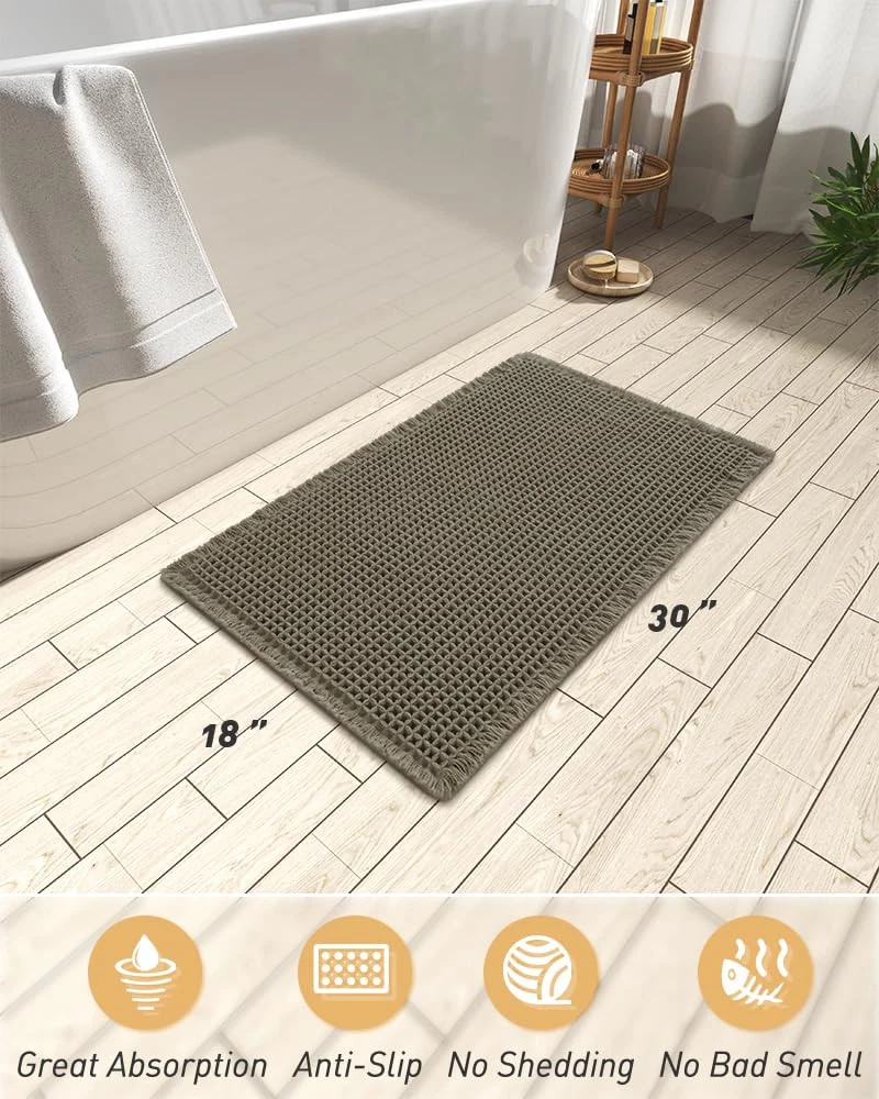 Upgraded Waffle Desgin: This boho bath mat is power-loomed with upgraded yarns-Integrating decoration and durability. The heavier and thicker threads are applied to make sure the pattern will be more solid and compact- NEVER OUT OF SHAPE! Great Water Absorption: Double layer of deep waffle texture absorbs water instantly and more breathable. In addition, the yarns we use is inherently absorbent-it absorb water like crazy. This absorbent bath mat can soak up the water and keep your floor dry like a giant sponge, and protect your feet from the cold floor. Clear Rubber Backing: This non slip bath mat is designed with clear rubber backing(HMA-Hot Melt Adhesive, invisible but touchable). This bathmat firmly grips the ground to prevent you and your families from falling. Comfortable and Soft: Three-dimensional waffle design combined with flexible yarns make the bathroom floor mat softer and cozier. Bring you a comfortable underfoot feeling. Enjoy a comfort space when you finishing shower. Easy to Maintain: Machine washable bathroom rugs provide convenience in your daily life. Recommend gentle mode,cold water. Or just shake the dust off from the bath rugs for simple cleaning.