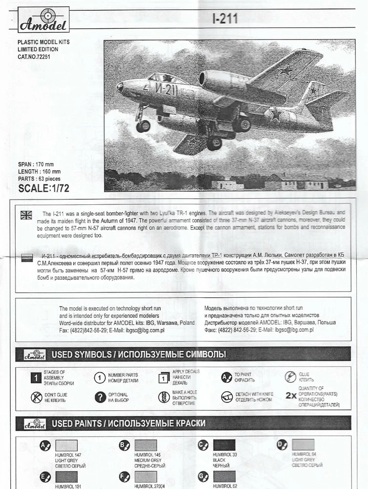 Plastic model kit High-quality details. Scale: 1:72 High-quality details. Manufacturer: AMODEL (Ukraine) Country/Region of Manufacture: Ukraine Composition: Plastic Model Kit Material: Plastic Paint: Unpainted, Unassembled, Kit do not contain paints and glue. Condition: New in Box Features: Kit Aircraft scale model Model length, mm: 160 The kit includes: 63 plastic parts decal (sticker) 1 frame made of transparent plastic (cabin lamp) scheme for coloring the model detailed instructions in English and Russian Glue, paint not included Quality set, simple assembly. Suitable for experienced modelers, as well as for beginners. Due to the use of modern production technologies, all the details of the model fit perfectly, thanks to this, you can get an excellent result with minimal effort. ----------- This is a plastic model kit. Assembly and painting is required. Paint and glue is NOT included. Item Type: Scale model kit Commodity Attribute: Assembly The model is a plastic assembly model and needs to be assembled and painted by yourself You need an extra purchase of the glue, paint and so on!