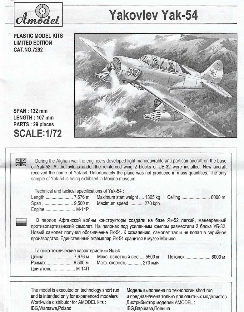 Plastic model kit High-quality details. Scale: 1:72 High-quality details. Manufacturer: AMODEL (Ukraine) Country/Region of Manufacture: Ukraine Composition: Plastic Model Kit Material: Plastic Paint: Unpainted, Unassembled, Kit do not contain paints and glue. Condition: New in Box Features: Kit Airplane scale model Wing span, mm: 113 Model length, mm: 96 The kit includes: plastic parts decal (sticker) the frame is made of transparent plastic (cabin lamp) scheme for coloring the model detailed instructions in English and Russian Glue, paint not included Yak-52B (Yak-54) - anti-guerrilla. It was distinguished by a reinforced wing. Armament consisted of 2 blocks of NURS UB-32. Developed in 1983 under the leadership of A.A. Yakovlev. Quality set, simple assembly. Suitable for experienced modelers, as well as for beginners. Due to the use of modern production technologies, all the details of the model fit perfectly, thanks to this, you can get an excellent result with minimal effort. ----------- This is a plastic model kit. Assembly and painting is required. Paint and glue is NOT included. Item Type: Scale model kit Commodity Attribute: Assembly The model is a plastic assembly model and needs to be assembled and painted by yourself You need an extra purchase of the glue, paint and so on!