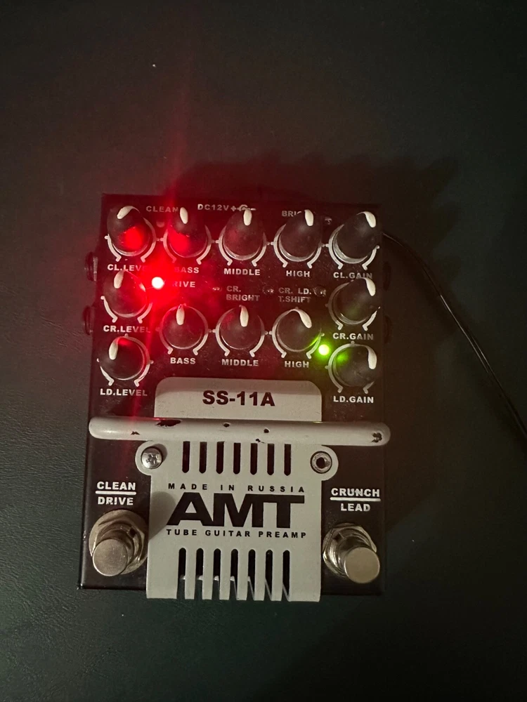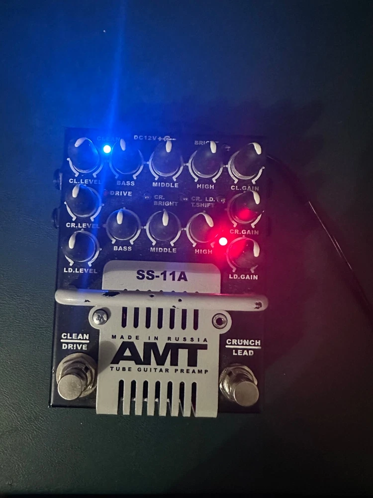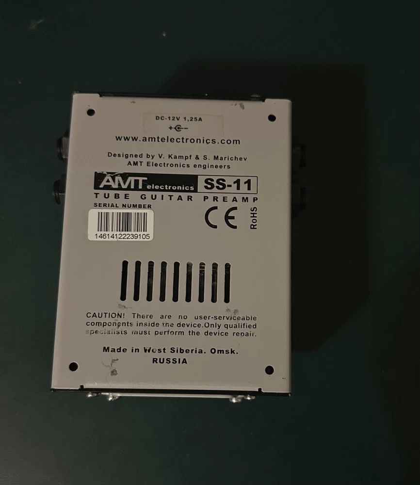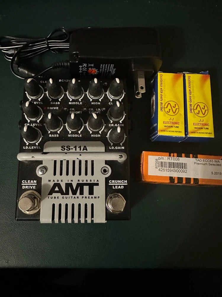 Three channel all tube preamp pedal. Very versatile “Marshally” tone. I’ve used with my cover band for about 6 years. 3 extra tubes included - JJ 12AY7, JJ ECC82 and TAD ECC83WA. 2 Sovtek 12AX7WA tubes installed. Unit has been installed on my pedalboard don’t have the rubber feet or the original power supply, a few scratches mostly on the “roll bar”, screw missing on tube cover. Functions perfectly. From the AMT website: The SS-11A Classic version is designed to cover all the classic jazzy, overdrive, and rock sounds of vintage tube amplifiers. The gain circuitry of LEAD channel is slightly less aggressive than the SS-11B (Clean and Crunch are the same). However, don't misjudge the A unit. It has plenty of bite and dirt,. The SS-11A is a perfect choice for the guitarist who wants to cover everything! Features of SS-11 Design: Fully tube-based 4 - stage overdrive channel with DUAL TUBE design (2x12AX7) with high-voltage anode voltage (+300 V). Three separate channels: CLEAN / OVERDRIVE / LEAD Individual gain sensitivity and output level controls for clean and crunch/lead channels. TREBLE SHIFT toggle switch to enter bright mode for that added punch of high end. FX LOOP for external effects. OUTPUT jack for connecting to both specialized guitar amplifiers with a standard level of 0 dB (GUITAR AMP mode) and a CAB SIM MIXER out with a standard level of -10dB and a guitar cabinet simulation. The preamp outputs are equipped with sophisticated solid-state buffers. SS-11 incorporates new field-effect transistor-based guitar cabinet impulse response emulator processing. Improved naturalness of sound when connected to line input. Special attention was paid to transistors anode power quality: preamp uses a specially designed high-voltage transformer minimizing the penetration of impulse noises into amplified signal. Description of SS-11 Channels: LEAD channel provides thick viscous sound for playing both chunky rhythm parts and singing solos with excellent presence. TREBLE SHIFT toggle to take your lead sound into bright mode, similar to the good old "Treble Booster" pedals in the 80's that guitarists used to enhance their solos. OVERDRIVE channel features a more open structure of the sound. This is the SS-11's sweet spot! VERY tubey and saturated sounding, much like that of the classic tube amps of the 70's and 80's! Wide range of sensitivity adjustment results in the sound starting from light crunch to thick and bright lead channel-like sound. Natural tube tone. If you're looking for something other than that dull sounding solid-state OD or TS clone sound, then THIS IS IT. CLEAN channel focuses on crystal clarity clean sound. Low, Mid, and High controls for tweaking your sound; as well as and TREBLE SHIFT toggle for adjusting high end response. SPECIFICATIONS: Tubes: 12AX7 or equivalent Input Impedance: 1MOhm Input Sensitivity: -10dB Output Impedance: 10kOhm Power Voltage: 12vDC (-)center Power Consumption: 600mA COMPATIBLE TUBES 12АХ7, ECC83 (or another 12AX7 compatible).