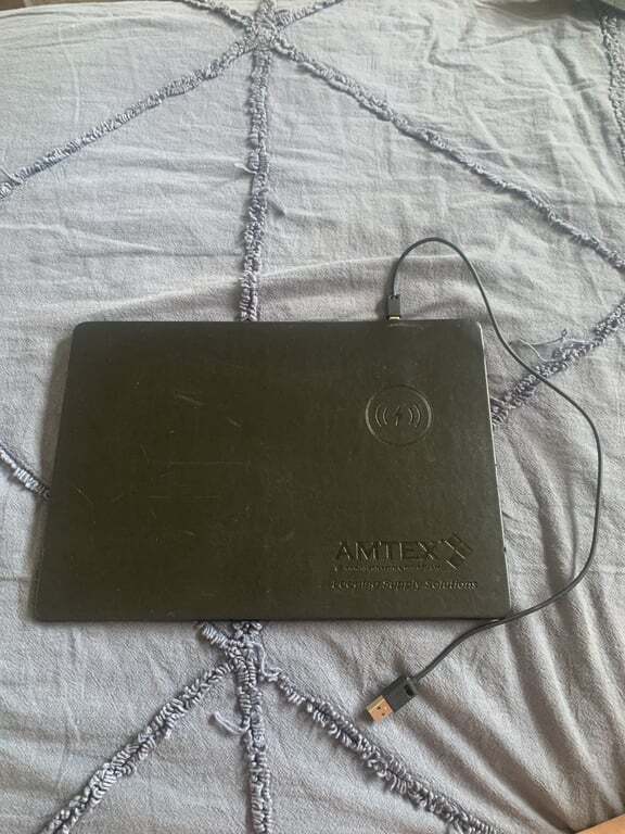 Convenient AMTEX wireless charging pad with a sleek design. Perfect for easy and efficient charging of your devices. Features a USB connection for versatile use. Ideal for home or office settings.
