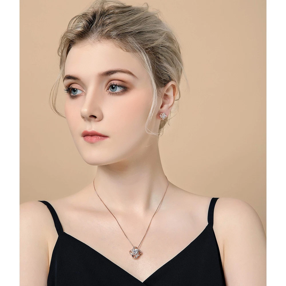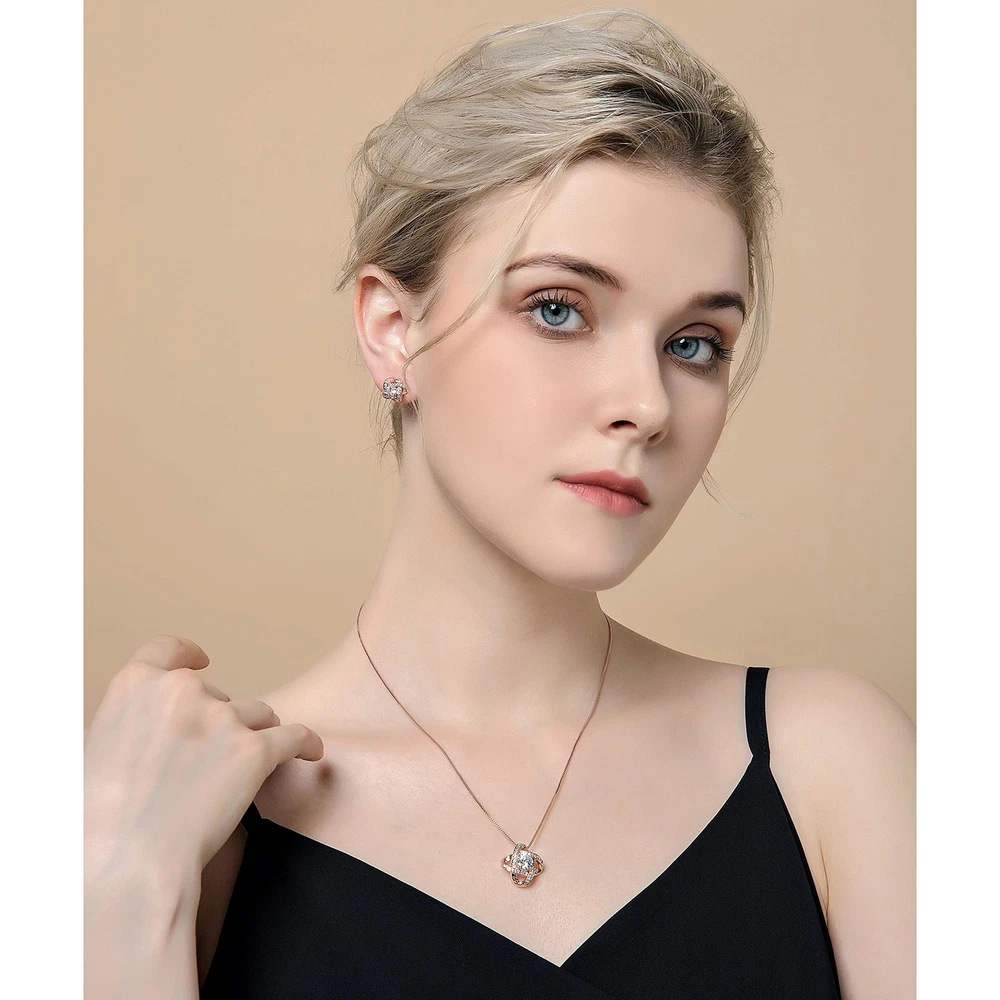 AMYJANE Bridal Jewelry Set for Women - Crystal Cubic Zirconia Love Knot Necklace Stud Earrings Elegant CZ Jewelry Set for Wedding Bride Bridesmaids Gift Set Product Details Color: Clear(14k Rose Gold Plated) Brand: AMYJANE MPN: JS Love Knot rose gold UPC: Does not apply EAN: Does not apply Is Discontinued By Manufacturer : No Department : womens Date First Available : January 14, 2018 Manufacturer : AMYJANE Brand, Seller, or Collection Name: AMYJANE Metal stamp: 14k Metal: Copper Material: Crystal Gem Type: Cubic Zirconia Setting: Prong-Setting Item Length: 3 inches Chain: Box Clasp: Lobster Clasp Resizable: No Number of stones: 5 Model number: JS Love Knot rose gold