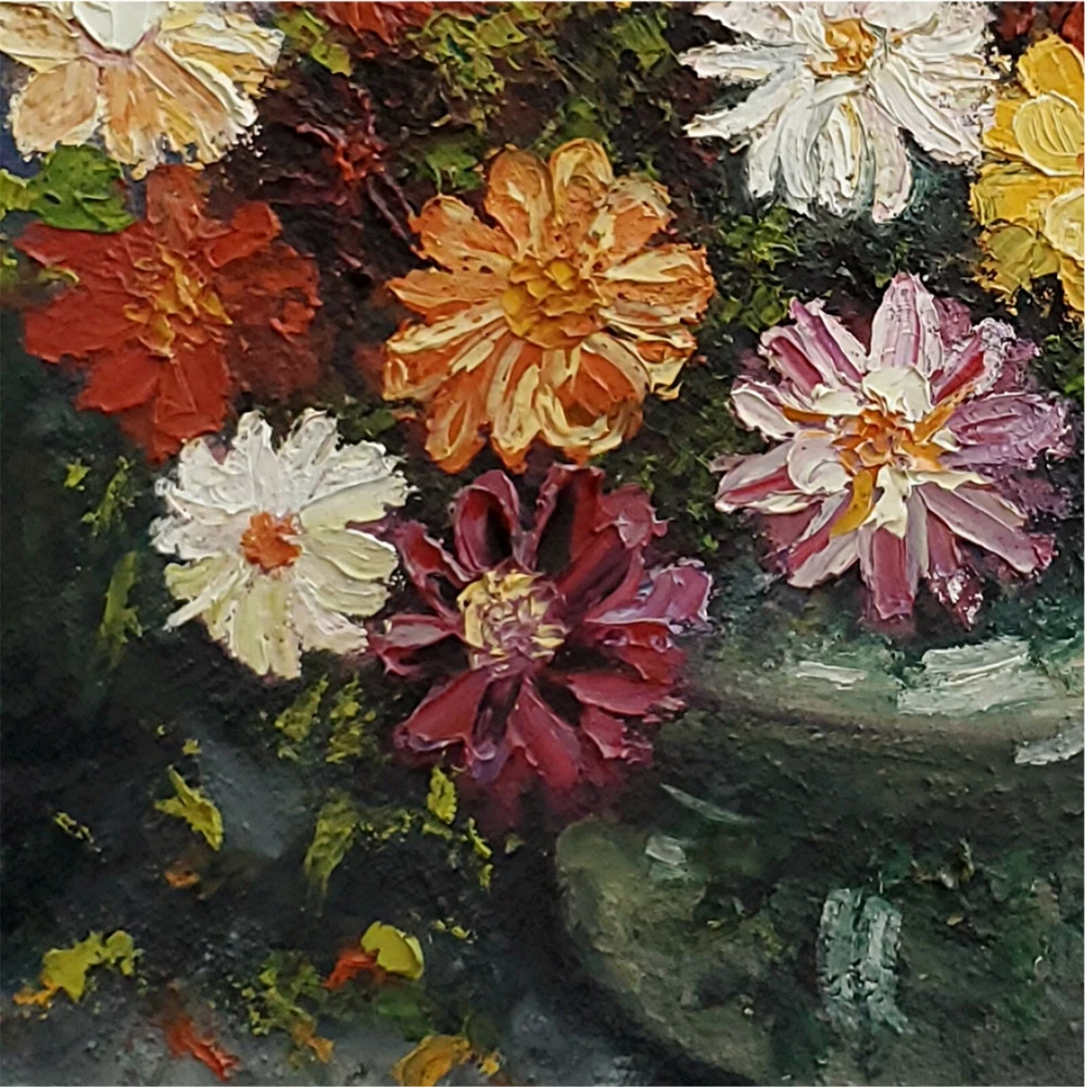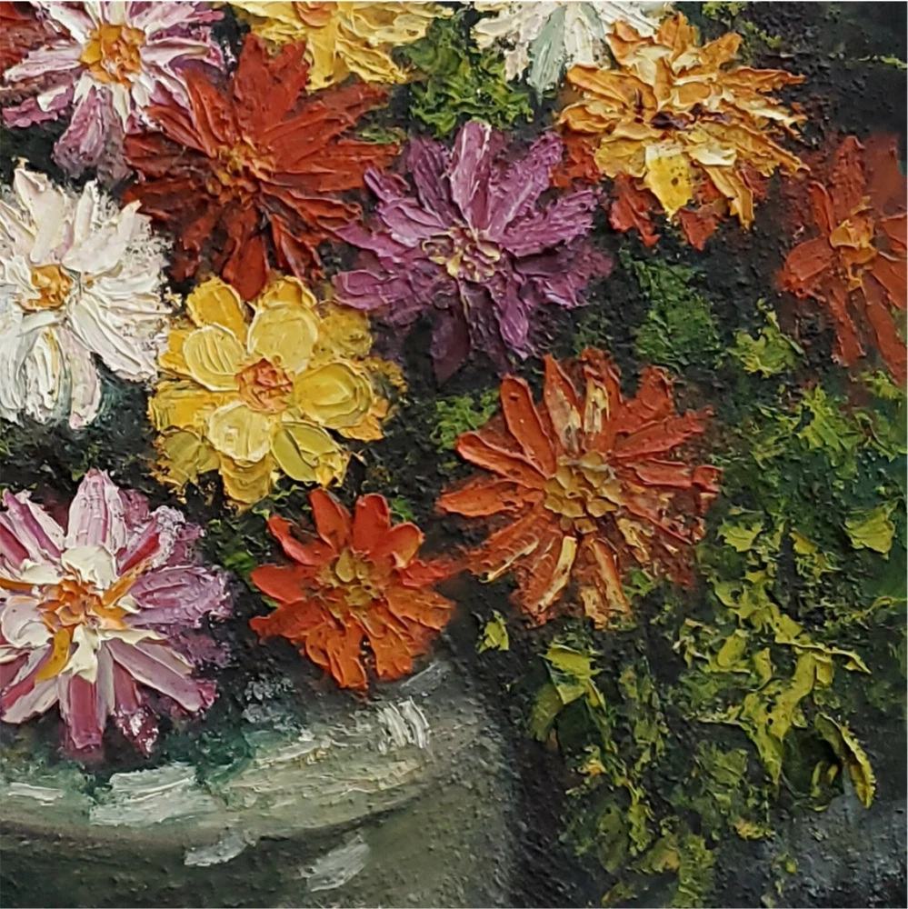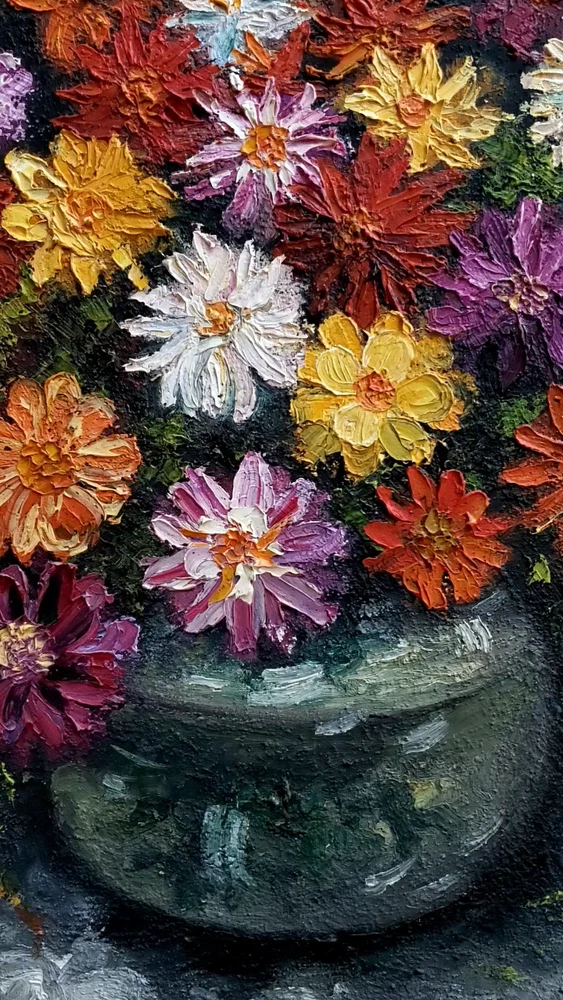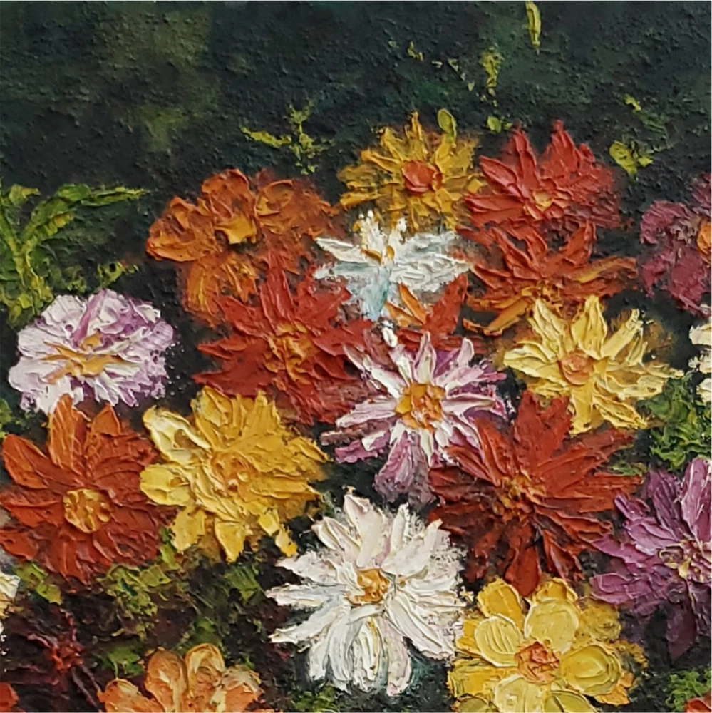 From Andre's personal collection, this still life floral is an oil on stretched canvas done in 2019 when he was utilizing a technique for preparing his canvases that gave them a rough texture. On top of that, his unmistakable palette knife style gives this painting even more dimension. The colors are vibrant and the texture is truly pronounced on this beautiful example of his signature floral style. Original oil painting titled " Garden Colors " SIZE 24" x 20" COA issued and included. Painting is on stretched canvas, fully varnished and ready to frame. Signed, dated, and titled on back of painting. Schooled in the fine art academies of Europe, with nearly 70 years of professional artist experience, Andre presents a bold, palette knife style with heavy texture and a decidedly modern take on the impressionist style. Buy directly from the studio and invest in a timeless piece of fine art. Collectors from all over the world own Andre's artworks. From corporate and public spaces, to private collections and home decor, Andre's work is renowned globally. Whether for yourself or as a present for someone special, a painting is a timeless gift that will serve as a memory for a lifetime. feb 6, 2025 .