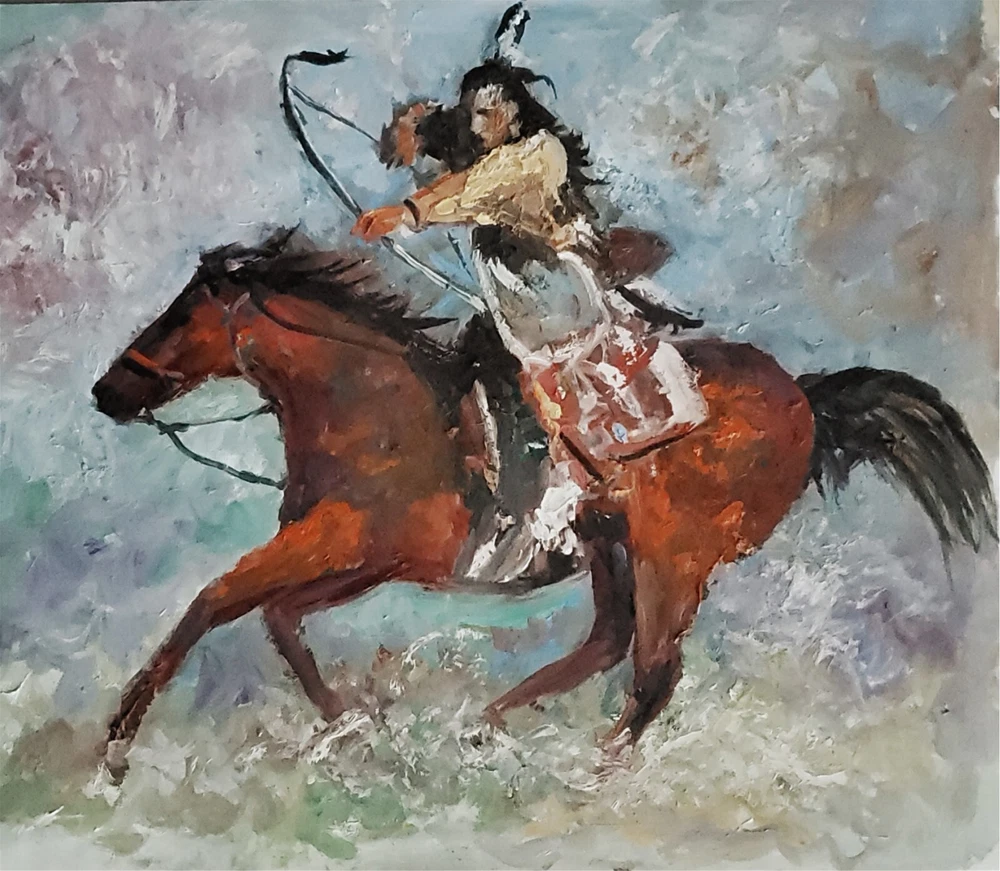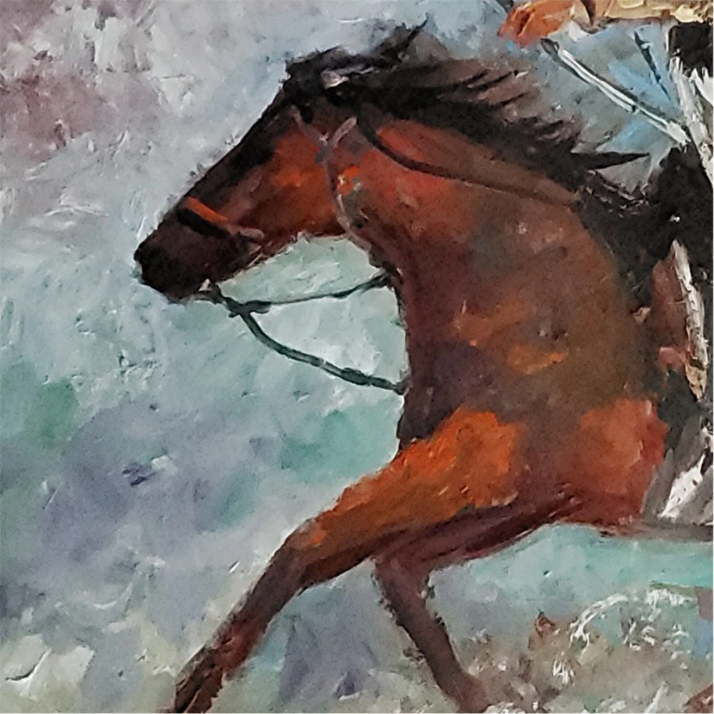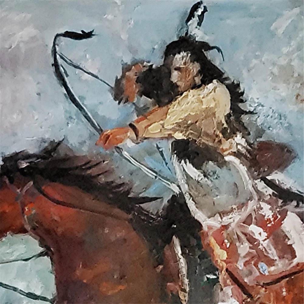 Original oil painting titled " Plains Rider " SIZE 18" x 20" COA issued and included. Painting is on prepped panel, fully varnished and ready to frame. Signed, dated, and titled on back of painting. Schooled in the fine art academies of Europe, and nearly 70 years of professional artist experience, Andre presents a bold, palette knife style with heavy texture and a decidedly modern take on the impressionist style. Buy directly from the studio and invest in a timeless piece of fine art. Collectors from all over the world own Andre's artworks. From corporate and public spaces, to private collections and home decor, Andre's work is renowned globally. Whether for yourself or as a present for someone special, a painting is a timeless gift that will serve as a memory for a lifetime. feb 8, 2025 .