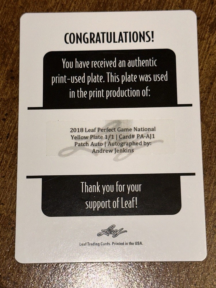 ANDREW JENKINS 2018 LEAF PERFECT GAME NATIONAL SHOWCASE Autographed YELLOW Printing Plate. FROM ATLANTA, GEORGIA AND PACE ACADEMY HIGH SCHOOL. COMMITTED TO GEORGIA TECH YELLOW JACKETS BASEBALL. DETROIT TIGERS MINOR LEAGUES Serial-Numbered #1/1!! Yes, true one of one!! Shipping is $5.50 with tracking. International Shipping via GLOBAL SHIPPING PROGRAM at this time. CHECK OUT THE OTHER ITEMS AVAILABLE!