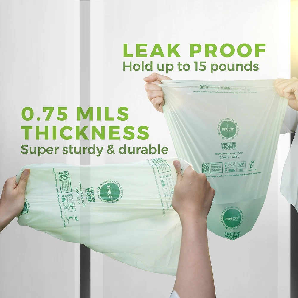 π ππ ππππππ π¨π πππππππ: Made from compostable ingredients such as corn starch and bio-based materials, ANECO trash bags decompose fully whether in industrial facilities or home & garden conditions. Our productsβ materials have been certified to be 100% compostable according to the very strict Australian Standard 4736-2006. π ππ ππ§π ππππππ ππππππ ππππππππ: ANECO products are 100% environmentally friendly according to the highest standards of certification organizations such as BPI (US Standard ASTM D6400), OK Compost HOME (EU Standard) and Seeding Logo (Australian Standard 4736-2006) π πππππππ ππ§π ππ ππππ: If youβve faced leaking issues by using flimsy trash bags, try our 100% Compostable ANECO trash bags. The ANECO trash bags is 0.75mils thick giving you full assurance to throw wet food scrap in worry-free of leaking issues. In addition to being extra thick, the ANECO compostable trash bags can carry weights up to 15 pounds. It is recommend that you should change the trash bags every two days to ensure hygiene. π π ππ ππ ππππ πππππ ππππ: The dimensions of the ANECO trash bag (length - width - diameter) is 17.7 - 16.9 - 5.3 inch, respectively. From circular, half-circle, rectangular to square shape trash can, the bag fits most types. The recommended trash can size has a height below 13.6 inch with a capacity under 3 gallon. π πππππππππππππ: ANECO compostable trash bags (unscented) can certifiably decompose into humus, CO2 and water within 6 - 12 months once composted (even as being buried in home garden). Therefore, these compostable trash bags are suitable for many purposes, including home & office use, outdoor activities, or for vermicomposting bins. All ANECO products are compliant with all labeling requirements set forth by California law, including SB 1383.