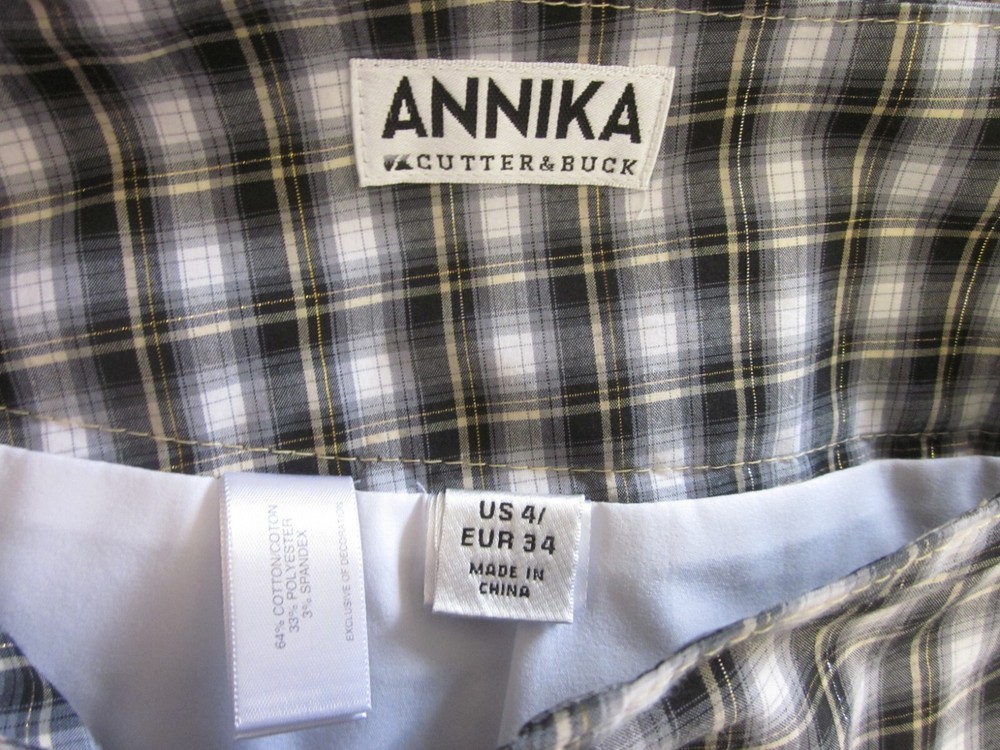 Brand:Annika by Cutter & BuckPerformance/Activity:GolfType:SkortSeller Notes:“Very good used condition”Pattern:PlaidMaterial:Cotton/Poly/SpandexStyle:SkortColor:Black/White/YellowSize:4Department:Women
